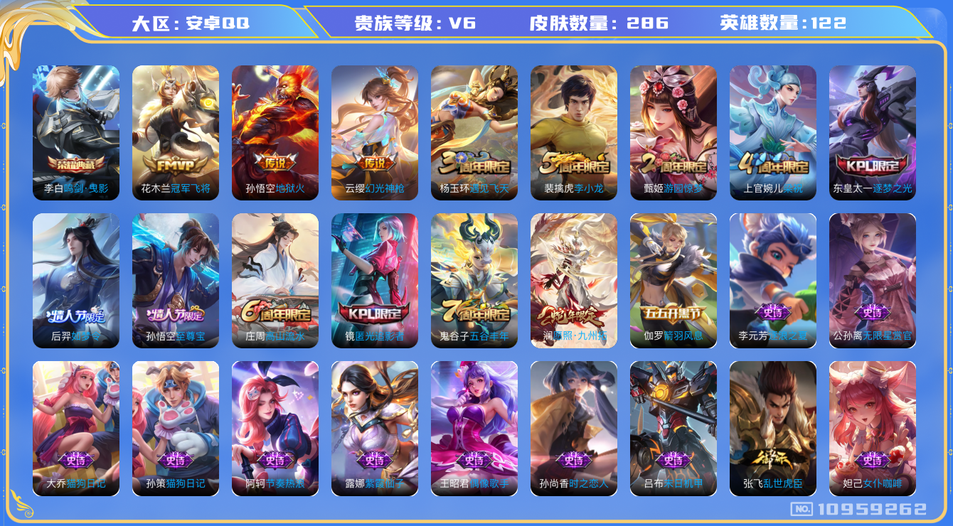 [10959262]【商品标题】:安卓Q-V5-至尊星耀IV段位-122英雄-286皮肤-1典藏-0珍品无双-0无双-0珍品传说-4传说-75史诗