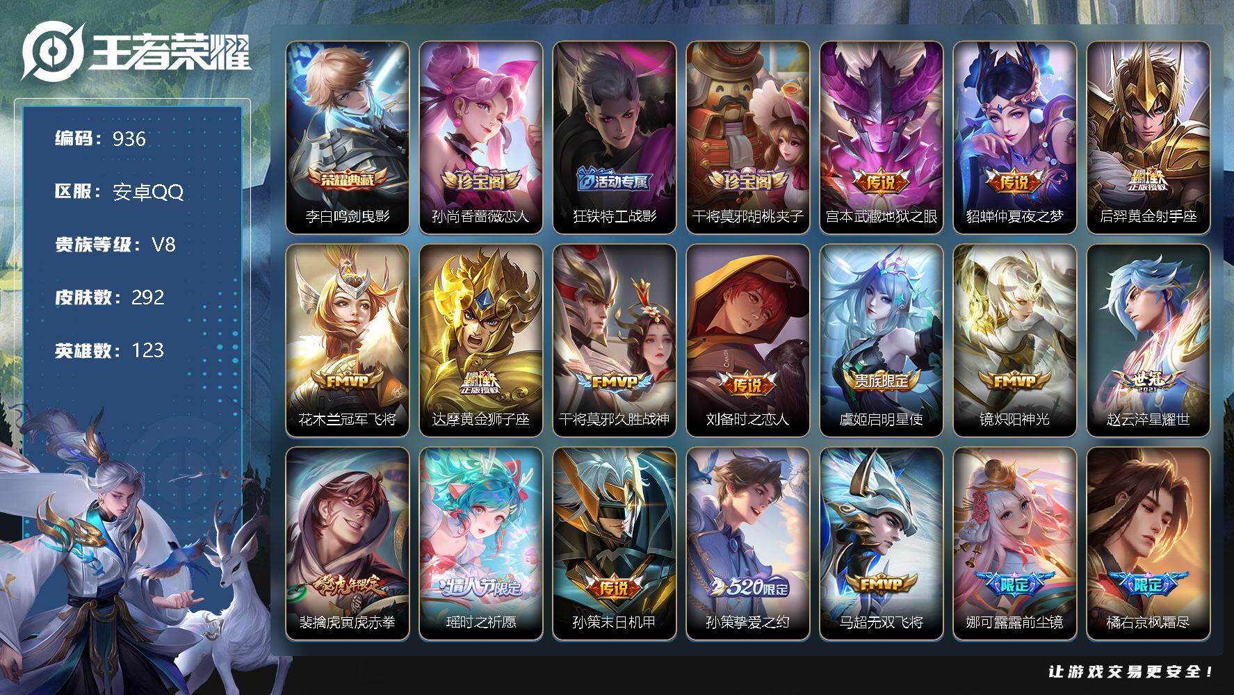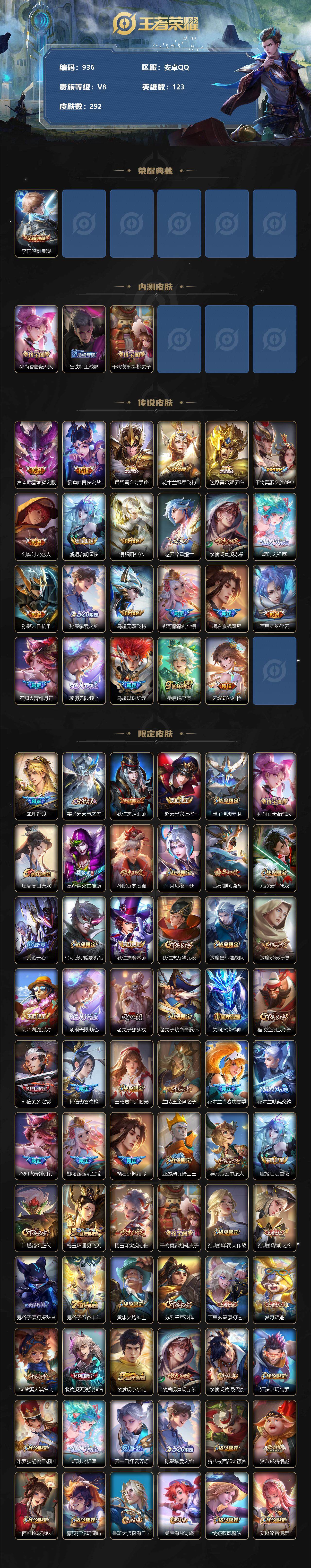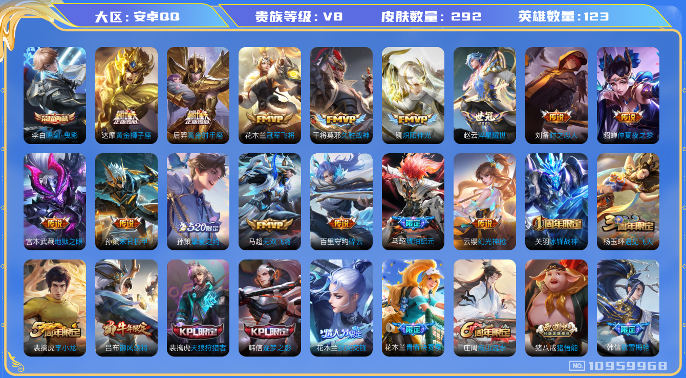 [10959968]【商品标题】:安卓Q-V8-最强王者段位-123英雄-292皮肤-1典藏-0珍品无双-0无双-0珍品传说-23传说-87史诗