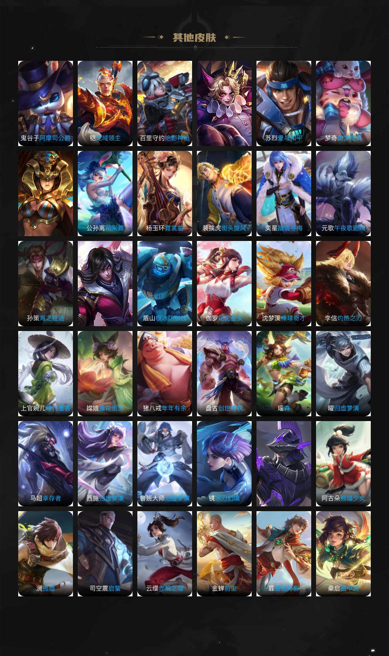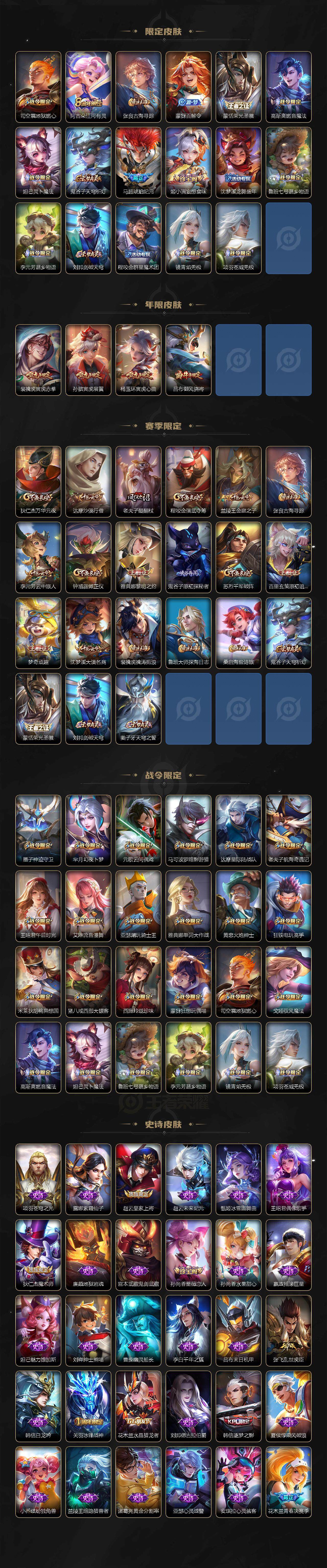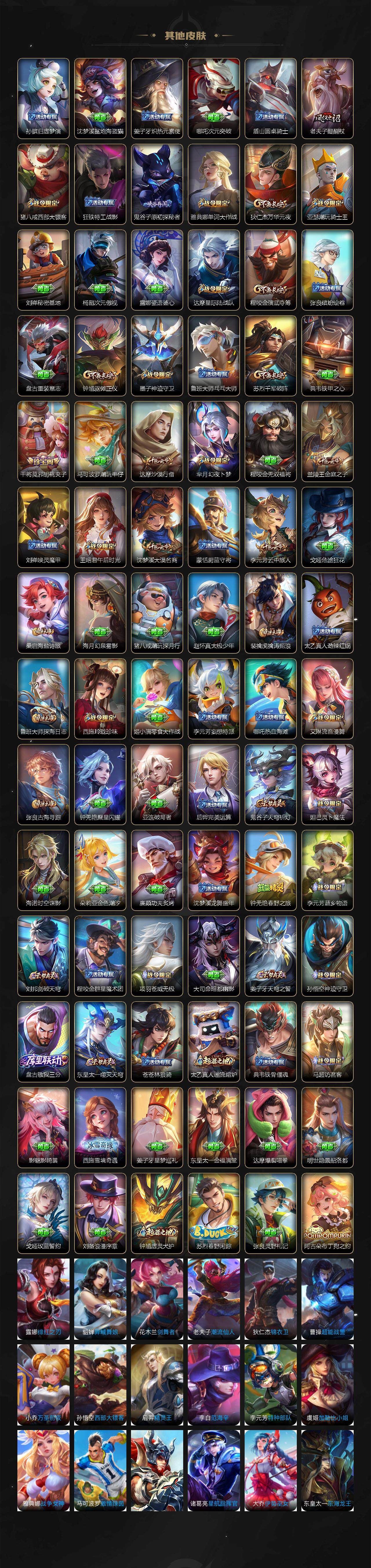 【限定皮肤】:暃埋骨钱,姜子牙天穹之誓,狄仁杰阴阳师,赵云皇家上将,墨子神迹守卫,孙尚香蔷薇恋人,庄周高山流水,高渐离死亡摇滚,孙膑寅虎展翼,芈月幻夜卜梦,吕布御风骁将,元歌云间偶戏,元歌无心,马可波罗暗影游猎,狄仁杰魔术师,狄仁杰万华元夜,达摩星际陆战队,达摩沙漠行僧,项羽海滩派对,项羽无限倾心,老夫子醍醐杖,老夫子航海奇遇记,关羽冰锋战神,程咬金演武夺筹,韩信逐梦之影,韩信傲雪梅枪,王昭君午后时光,兰陵王金庭之子,花木兰青春决赛季,花木兰默契交锋,不知火舞绯月行,娜可露露前尘镜,橘右京枫霜尽,亚瑟潮玩骑士王,李元芳云中旅人,虞姬启明星使,钟馗驱傩正仪,杨玉环遇见飞天,杨玉环寅虎心曲,干将莫邪胡桃夹子,雅典娜单词大作战,雅典娜黎明之约,鬼谷子原初探秘者,鬼谷子五谷丰年,黄忠火炮绅士,苏烈千军破阵,百里玄策原初追逐者,梦奇顽趣,沈梦溪大漠名商,裴擒虎天狼狩猎者,裴擒虎李小龙,裴擒虎寅虎赤拳,裴擒虎擒涛扼浪,狂铁电玩高手,米莱狄胡桃异想国,瑶时之祈愿,云中君纤云弄巧,孙策挚爱之约,猪八戒西部大镖客,猪八戒猪悟能,西施玲珑珍味,蒙犽狂想玩偶喵,鲁班大师探海日志,桑启海盐诗旅,戈娅驭风魔法,艾琳流音漫舞,司空震地狱燃心,阿古朵江河有灵,张良古海寻踪,蒙犽百解令,蒙恬荣光圣徽,高渐离燃音魔法,妲己灵卜魔法,鬼谷子天穹祈灯,马超琥珀纪元,姬小满妄想食味,沈梦溪龙舞盛年,鲁班七号蔬乡物语,李元芳蔬乡物语,刘邦剑破天穹,程咬金群星魔术团,镜青焰无极,项羽苍威无极