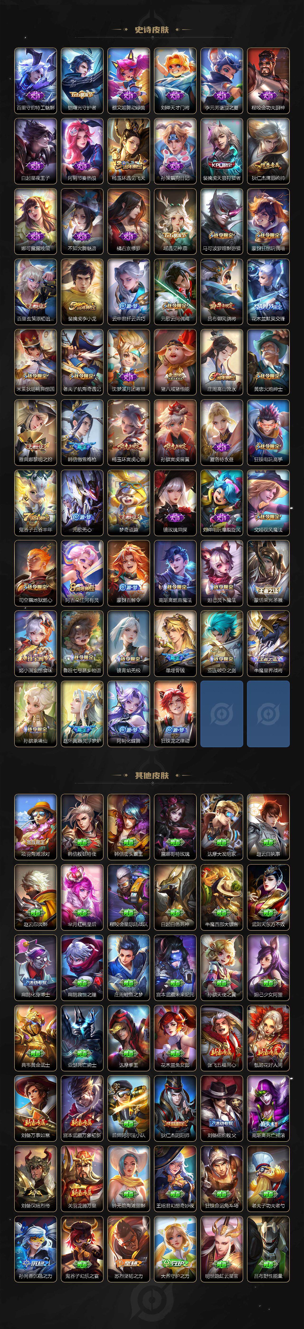 - [11939957]V10 4典藏 3无双 4珍品传说 58传说 126英雄 427皮肤 典藏英雄武则天 可修改实名 优质装备:大秦宣太后,鸣剑·曳影,九霄神辉(木兰典藏),弑枪猎影(韩信典藏),青丘·九尾(妲己无双),韩信群星魔术团(韩信无双),离恨烟(公孙离无双),江户川柯南,怪盗基德,朽木白哉,黑崎一护,黄金狮子座,黄金射手座,冠军飞将,云鹰飞将(小将军),绛天战甲(鸡嘴战神),黄金白羊座,猫影幻舞,久胜战神,炽阳神光,一念神魔,云霓雀翎,末日机甲-孙尚香(绿蚂蚱),地狱火,仲夏夜之梦(大飞蛾),音你心动-小乔,海洋之心,地狱之眼,飞鸢探春,胖达荣荣,李逍遥,乞巧织情,时之恋人-刘备(电焊工),游龙清影(小青龙),淬星耀世,超时空战士-狄仁杰,花朝如约(花篮子),无双飞将,碎云,神器·狴犴令,山海·炽霜斩(李信年限),山海·琳琅生(小乔年限),燃星之曲,记忆之芯(机甲兔),青丘·九尾,电玩·雷克斯,灼幽烈阳,惊梅引,霜月吟,澜逐花归海,艾琳觅芳踪,琥珀纪元铠,琥珀纪元马超,金乌负日,黄金天蝎座,云中君群星魔术团 传说皮:乘龙·问璇玑(孙尚香年限),乘龙·铭钟鼎(赵云年限),乘龙·淬吴钩(孙策年限),貂蝉曦玄引,吕布曦玄引,典韦战鼓燎原,落雪白狼 珍宝阁皮:万物之道,优雅恋人,玩趣恶龙 限定皮:鸣野蒿,至尊宝,白虎志(电光耗子),傲雪梅枪,神威(电光马子),遇见飞天,高山流水,诗剑行,怒海麟威,五谷丰年,梁祝,天狼狩猎者,李小龙,孙行者,猪悟能,一生所爱,大圣娶亲,冰霜恋舞曲,云端筑梦师,蜜橘之夏,女儿国国王,寅虎·赤拳(老虎年限),玉兔公主,唐三藏,枫霜尽,山海·玄木吟(马可年限) 史诗皮:鸭鸭历险记-刘禅,灵蛊蚀心,星界战将,龙之律动,石田雨龙,涂山红红,东方月初,琥珀纪元伽罗,决胜骁骑,上官婉儿群星魔术团,蔬乡物语(鲁班七号),乘龙·聚宝船(安琪拉年限),乘龙·忆丹青(大乔年限),百相守梦-百里守约,紫霞仙子,苍穹之光,电玩小子(小书包),黄金分割率,特工魅影,千年之狐,永昼,江河有灵,末日机甲-莱西奥,鹤归松栖(赵怀真),雪夜绮愿(周瑜),完美假期,闲日渔趣,魅语,百解令(蒙犽),蒙恬荣光圣徽,无限星赏官,冰冠公主,青蛇,偶像歌手,白蛇,晚萤,暗夜猫娘,银翎春语,龙骑士(小龙虾),末日机甲-吕布,猫狗日记-孙策,猫狗日记-大乔,时之恋人-孙尚香,乱世虎臣,节奏热浪,修