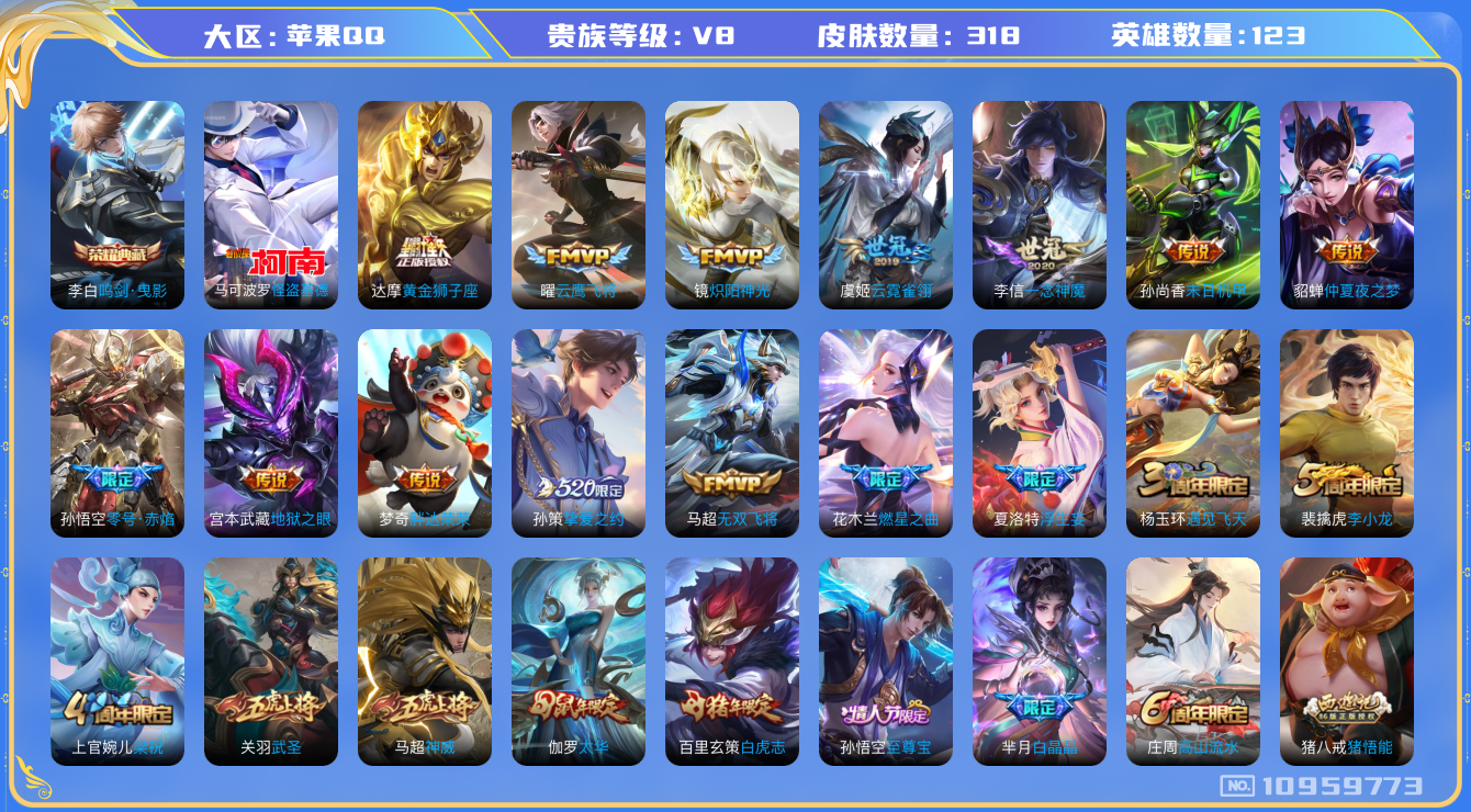 [10959773]【商品标题】:苹果Q-V8-永恒钻石V段位-123英雄-318皮肤-1典藏-0珍品无双-0无双-1珍品传说-21传说-82史诗
