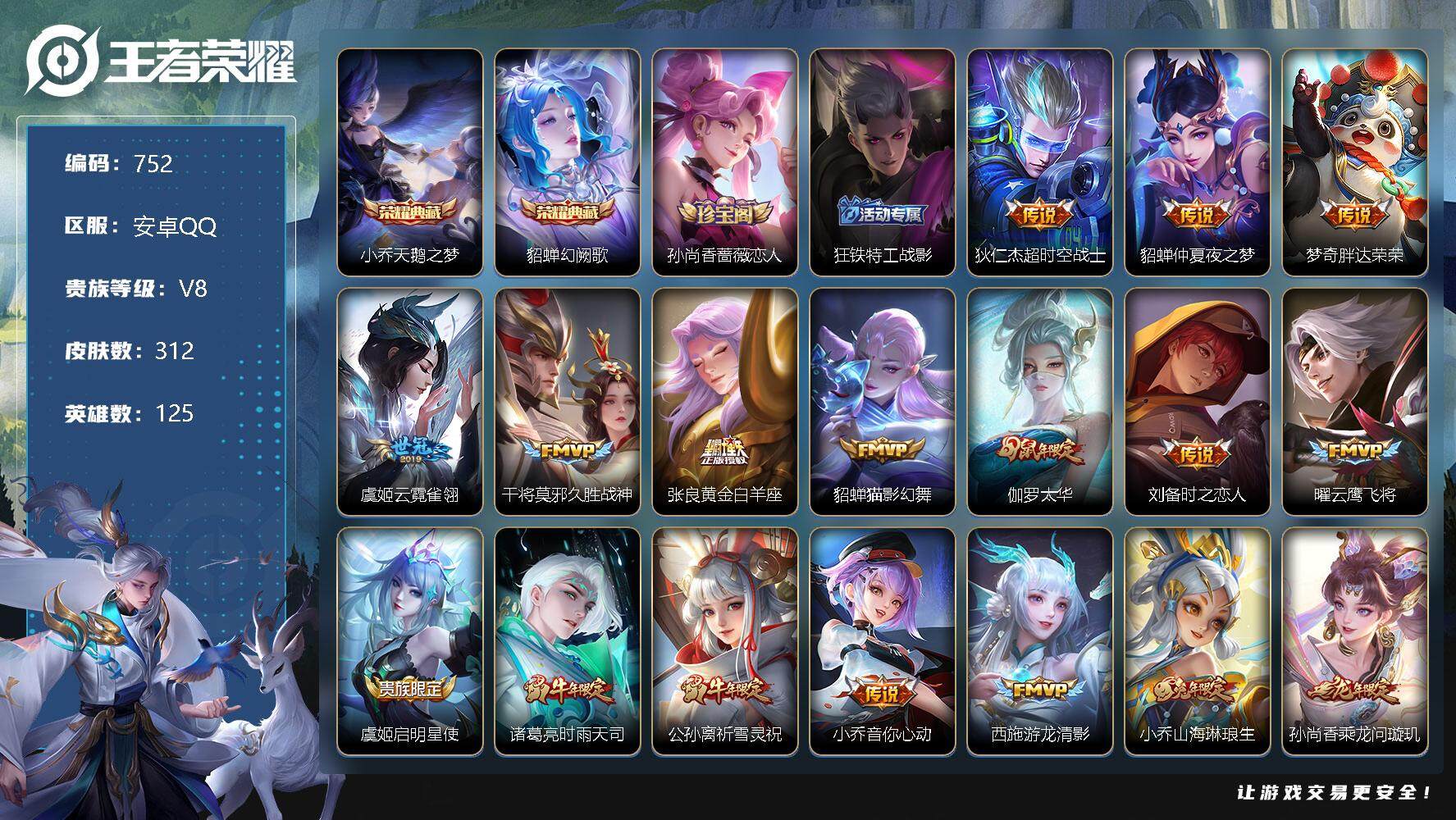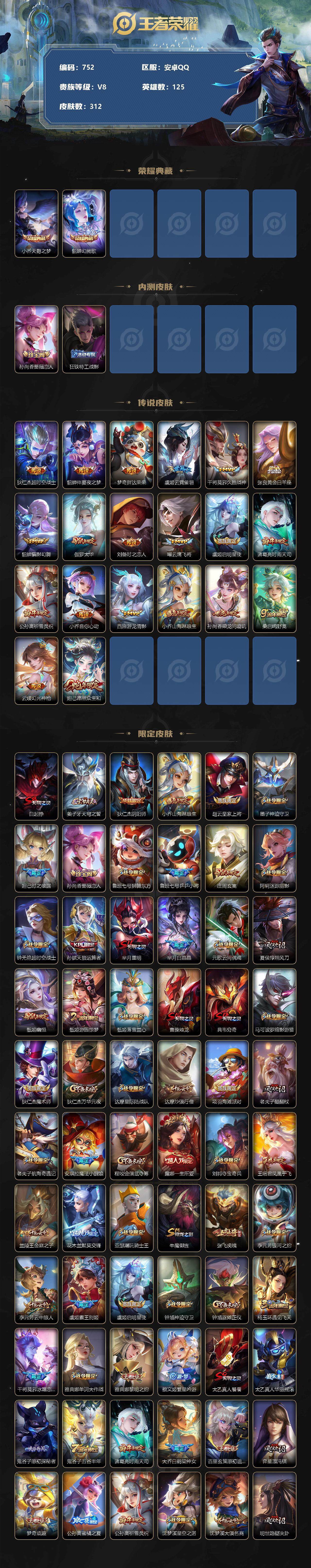 [10959029]【商品标题】:安卓Q-V8-至尊星耀III段位-125英雄-312皮肤-2典藏-0珍品无双-0无双-0珍品传说-20传说-89史诗
