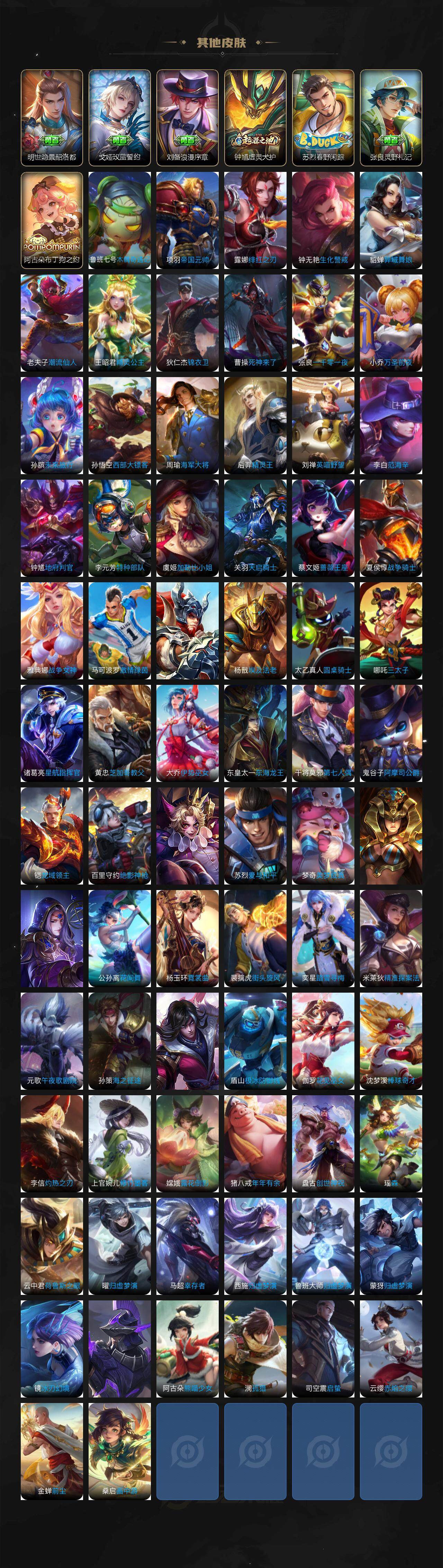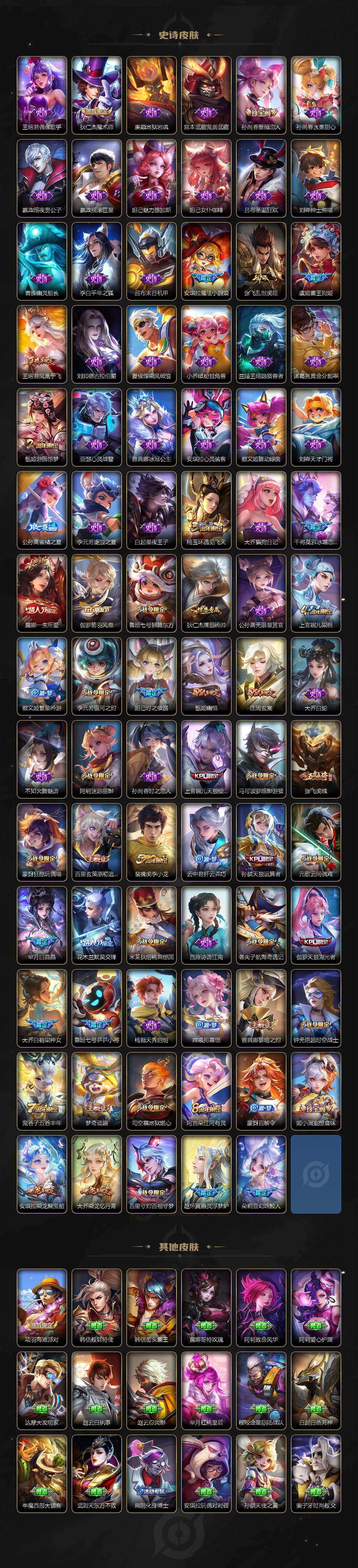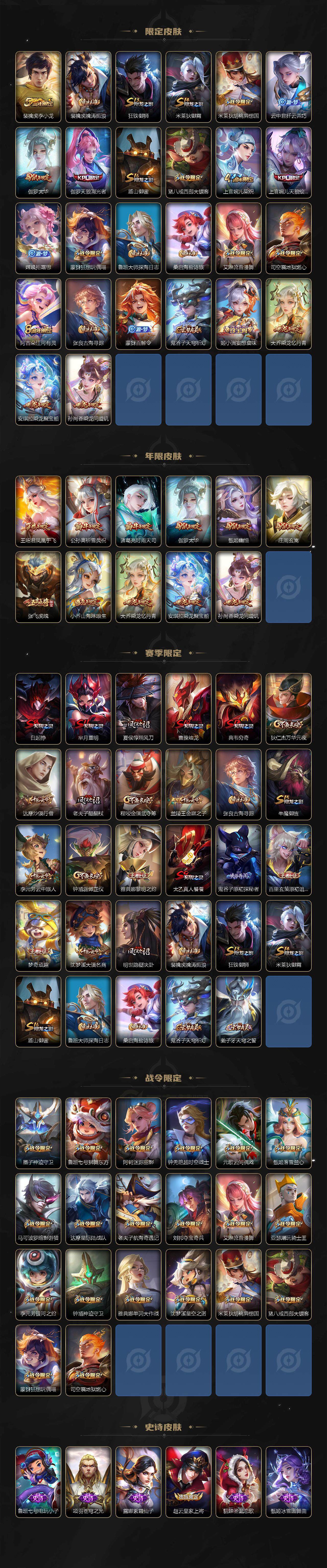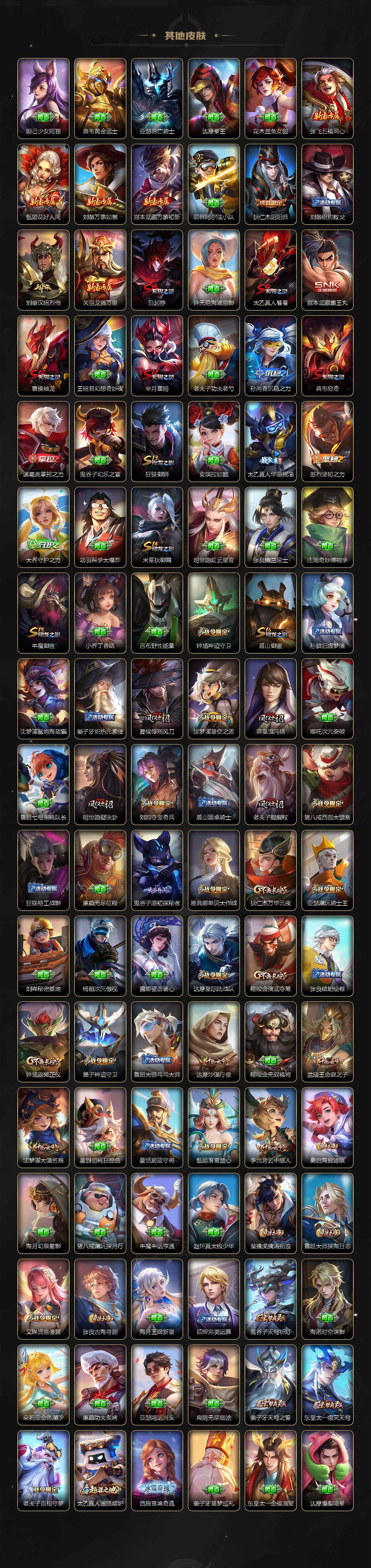 【限定皮肤】:白起狰,姜子牙天穹之誓,狄仁杰阴阳师,小乔山海琳琅生,赵云皇家上将,墨子神迹守卫,妲己时之彼端,孙尚香蔷薇恋人,鲁班七号狮舞东方,鲁班七号乒乒小将,庄周玄嵩,阿轲迷踪丽影,钟无艳超时空战士,孙膑天狼运算者,芈月重明,芈月白晶晶,元歌云间偶戏,夏侯惇朔风刀,甄姬幽恒,甄姬游园惊梦,甄姬落雪兰心,曹操烛龙,典韦穷奇,马可波罗暗影游猎,狄仁杰魔术师,狄仁杰万华元夜,达摩星际陆战队,达摩沙漠行僧,项羽海滩派对,老夫子醍醐杖,老夫子航海奇遇记,安琪拉魔法小厨娘,程咬金演武夺筹,露娜一生所爱,刘邦夺宝奇兵,王昭君凤凰于飞,兰陵王金庭之子,花木兰默契交锋,亚瑟潮玩骑士王,牛魔御旌,张飞虎魄,李元芳银河之约,李元芳云中旅人,虞姬霸王别姬,虞姬启明星使,钟馗神迹守卫,钟馗驱傩正仪,杨玉环遇见飞天,干将莫邪冰霜恋舞曲,雅典娜单词大作战,雅典娜黎明之约,蔡文姬繁星吟游,太乙真人饕餮,太乙真人华丽摇滚,鬼谷子原初探秘者,鬼谷子五谷丰年,诸葛亮时雨天司,大乔白鹤梁神女,百里玄策原初追逐者,弈星混沌棋,梦奇顽趣,公孙离蜜橘之夏,公孙离祈雪灵祝,沈梦溪星空之诺,沈梦溪大漠名商,明世隐疑决卦,裴擒虎李小龙,裴擒虎擒涛扼浪,狂铁御狮,米莱狄御霄,米莱狄胡桃异想国,云中君纤云弄巧,伽罗太华,伽罗天狼溯光者,盾山御銮,猪八戒西部大镖客,上官婉儿梁祝,上官婉儿天狼绘梦者,嫦娥拒霜思,蒙犽狂想玩偶喵,鲁班大师探海日志,桑启海盐诗旅,艾琳流音漫舞,司空震地狱燃心,阿古朵江河有灵,张良古海寻踪,蒙犽百解令,鬼谷子天穹祈灯,姬小满妄想食味,大乔乘龙忆丹青,安琪拉乘龙聚宝船,孙尚香乘龙问璇玑
