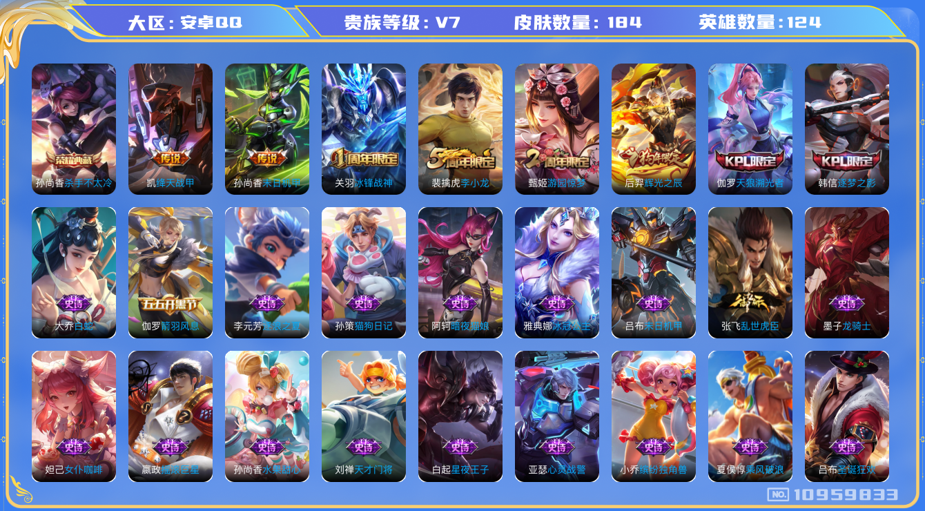 [10959833]【商品标题】:安卓Q-V7-最强王者段位-124英雄-184皮肤-1典藏-0珍品无双-0无双-0珍品传说-2传说-40史诗