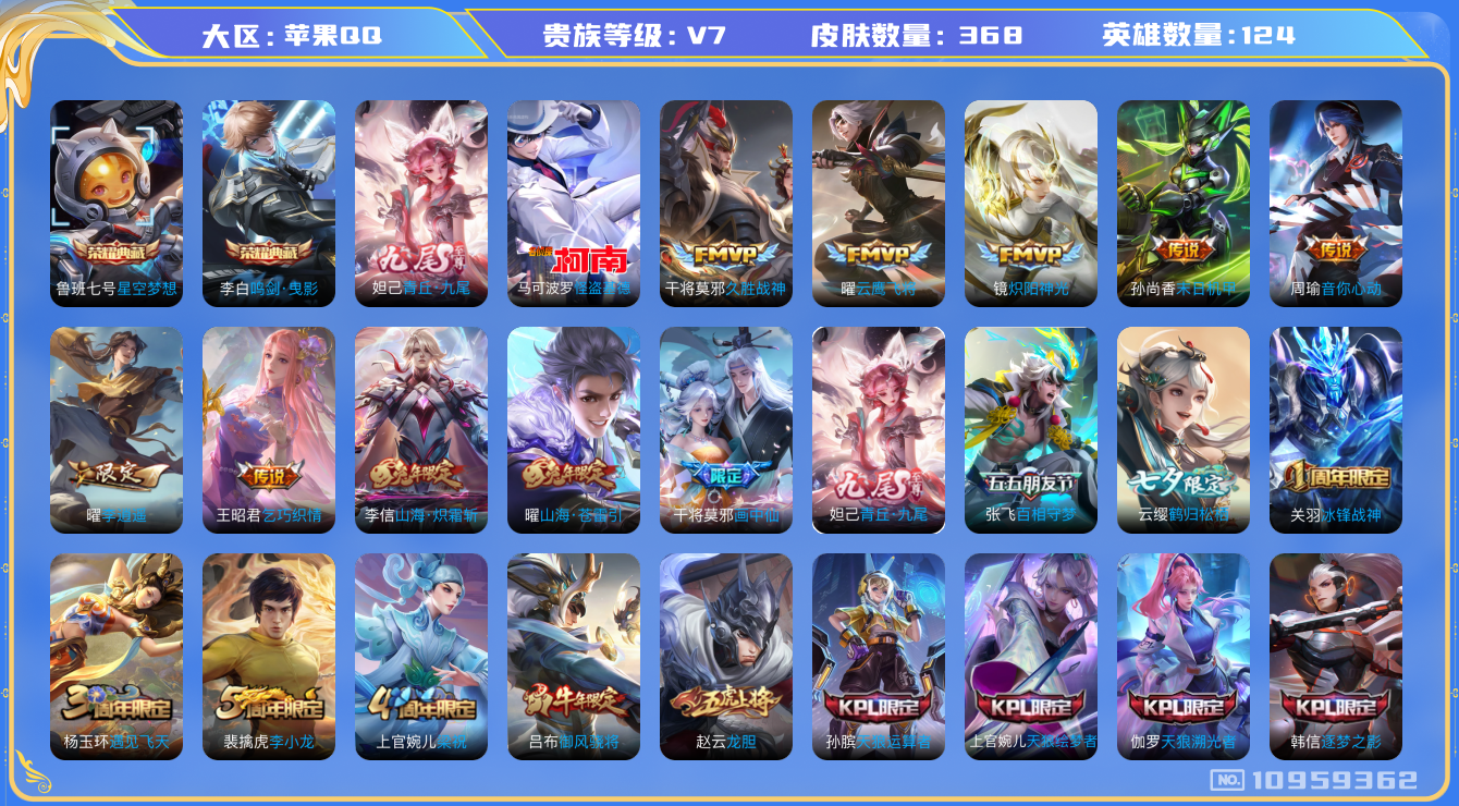 [10959362]【商品标题】:苹果Q-V7-至尊星耀I段位-124英雄-368皮肤-2典藏-0珍品无双-1无双-1珍品传说-15传说-105史诗