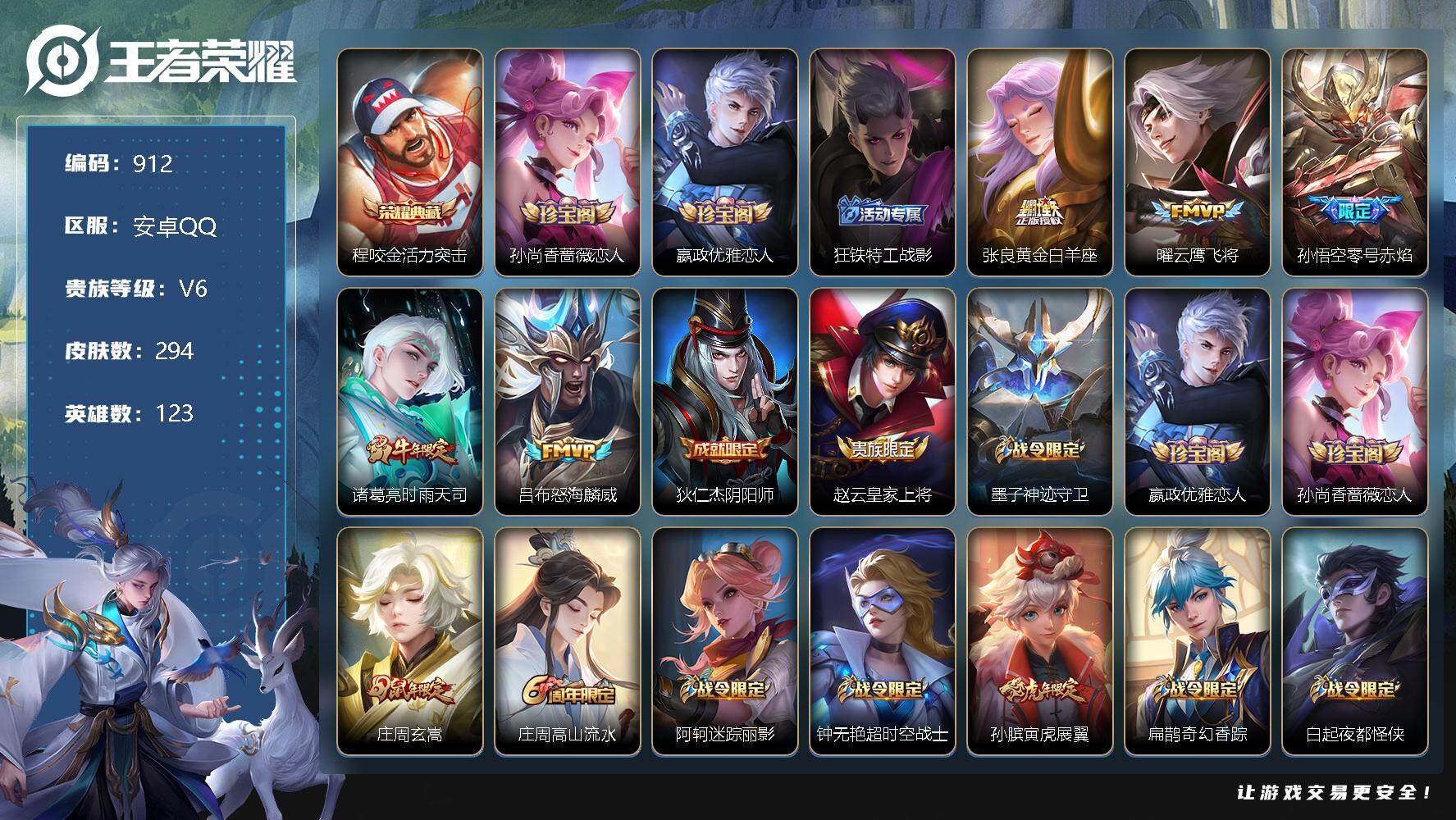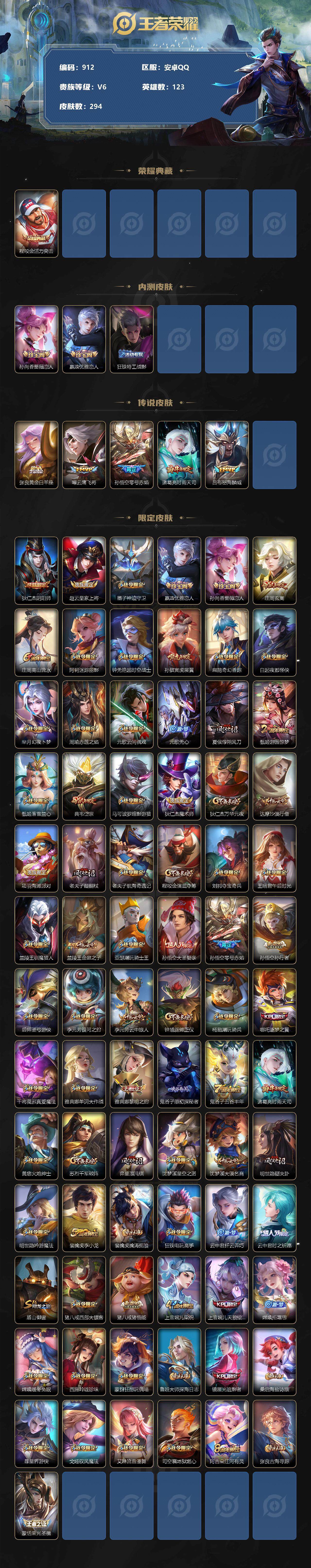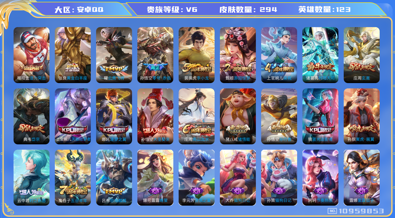 [10959853]【商品标题】:安卓Q-V6-永恒钻石IV段位-123英雄-294皮肤-1典藏-0珍品无双-0无双-0珍品传说-5传说-84史诗