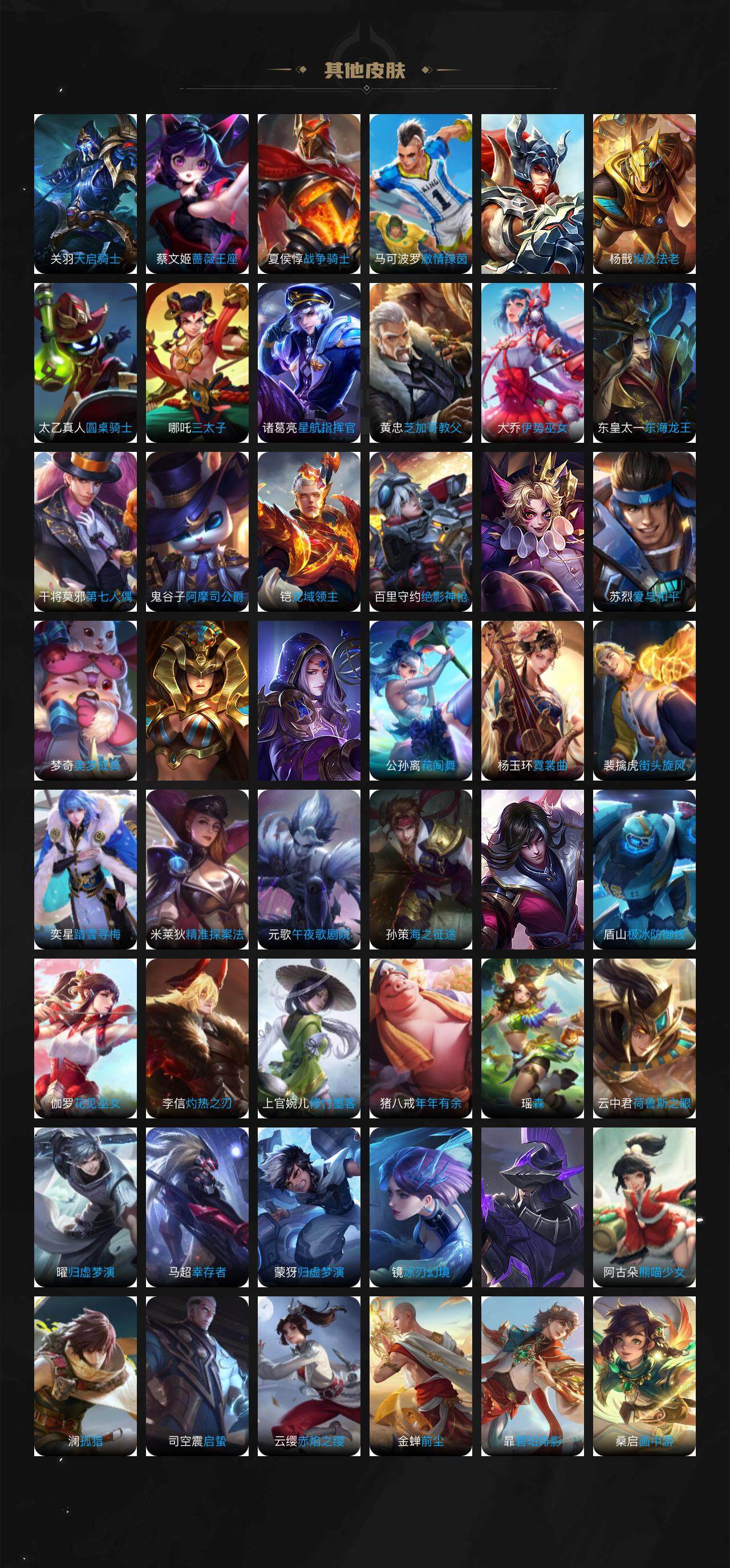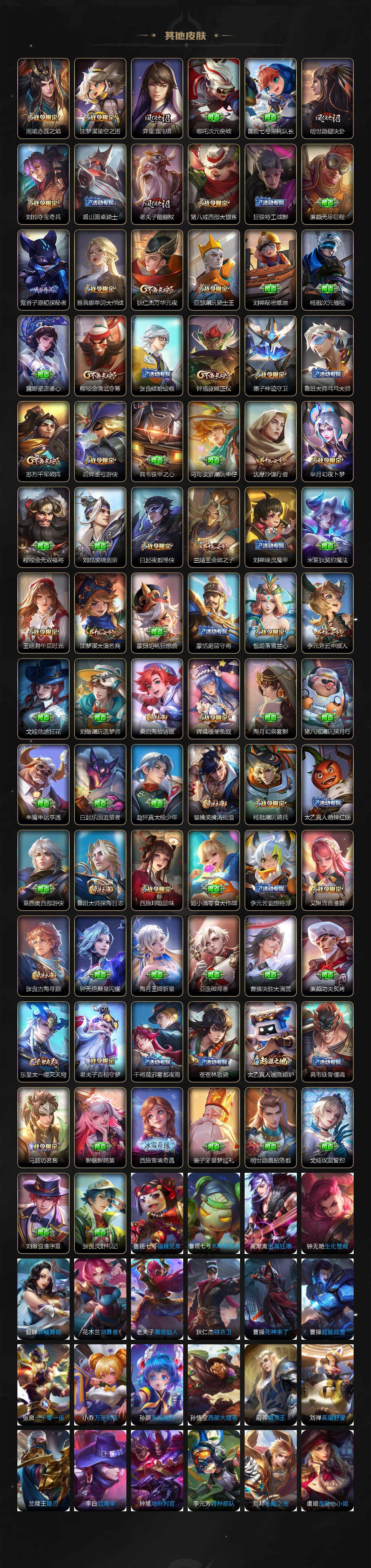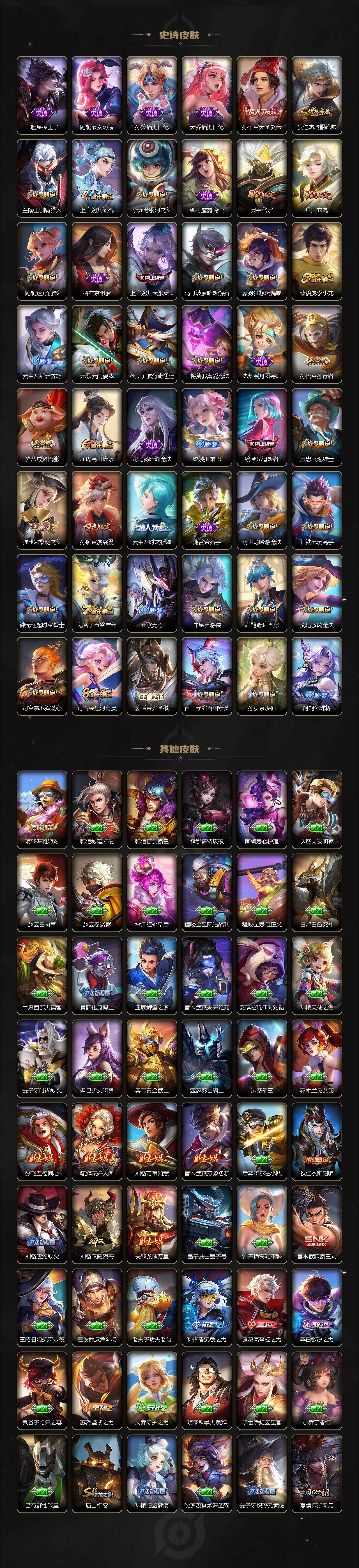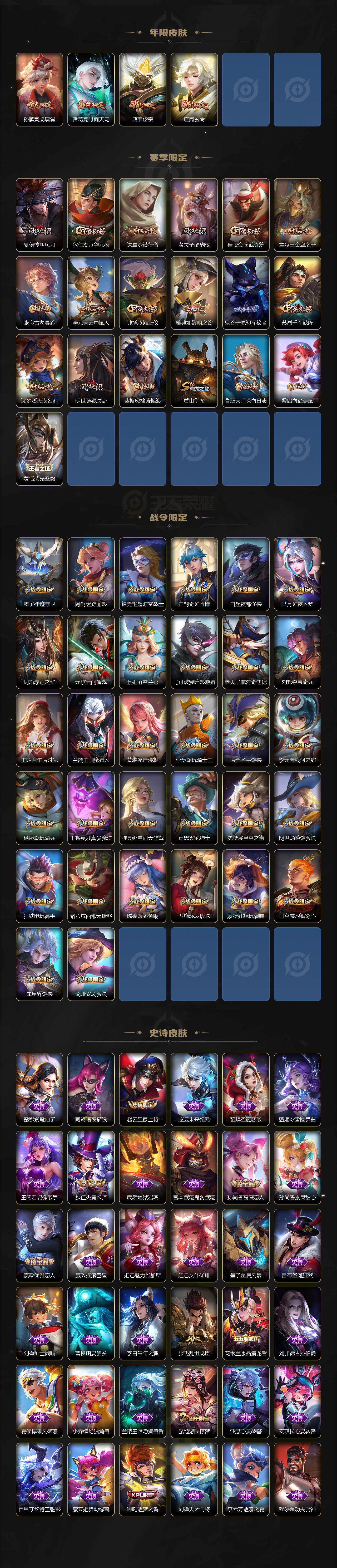 【限定皮肤】:狄仁杰阴阳师,赵云皇家上将,墨子神迹守卫,嬴政优雅恋人,孙尚香蔷薇恋人,庄周玄嵩,庄周高山流水,阿轲迷踪丽影,钟无艳超时空战士,孙膑寅虎展翼,扁鹊奇幻香踪,白起夜都怪侠,芈月幻夜卜梦,周瑜赤莲之焰,元歌云间偶戏,元歌无心,夏侯惇朔风刀,甄姬游园惊梦,甄姬落雪兰心,典韦岱宗,马可波罗暗影游猎,狄仁杰魔术师,狄仁杰万华元夜,达摩沙漠行僧,项羽海滩派对,老夫子醍醐杖,老夫子航海奇遇记,程咬金演武夺筹,刘邦夺宝奇兵,王昭君午后时光,兰陵王驯魔猎人,兰陵王金庭之子,亚瑟潮玩骑士王,孙悟空大圣娶亲,孙悟空零号赤焰,孙悟空孙行者,后羿圣弓游侠,李元芳银河之约,李元芳云中旅人,钟馗驱傩正仪,杨戬潮玩骑兵,哪吒逐梦之翼,干将莫邪真爱魔法,雅典娜单词大作战,雅典娜黎明之约,鬼谷子原初探秘者,鬼谷子五谷丰年,诸葛亮时雨天司,黄忠火炮绅士,苏烈千军破阵,弈星混沌棋,沈梦溪星空之诺,沈梦溪大漠名商,明世隐疑决卦,明世隐吟游魔法,裴擒虎李小龙,裴擒虎擒涛扼浪,狂铁电玩高手,云中君纤云弄巧,云中君时之祈愿,盾山御銮,猪八戒西部大镖客,猪八戒猪悟能,上官婉儿梁祝,上官婉儿天狼绘梦者,嫦娥拒霜思,嫦娥暖冬兔眠,西施玲珑珍味,蒙犽狂想玩偶喵,鲁班大师探海日志,镜匿光追影者,桑启海盐诗旅,暃星界游侠,戈娅驭风魔法,艾琳流音漫舞,司空震地狱燃心,阿古朵江河有灵,张良古海寻踪,蒙恬荣光圣徽