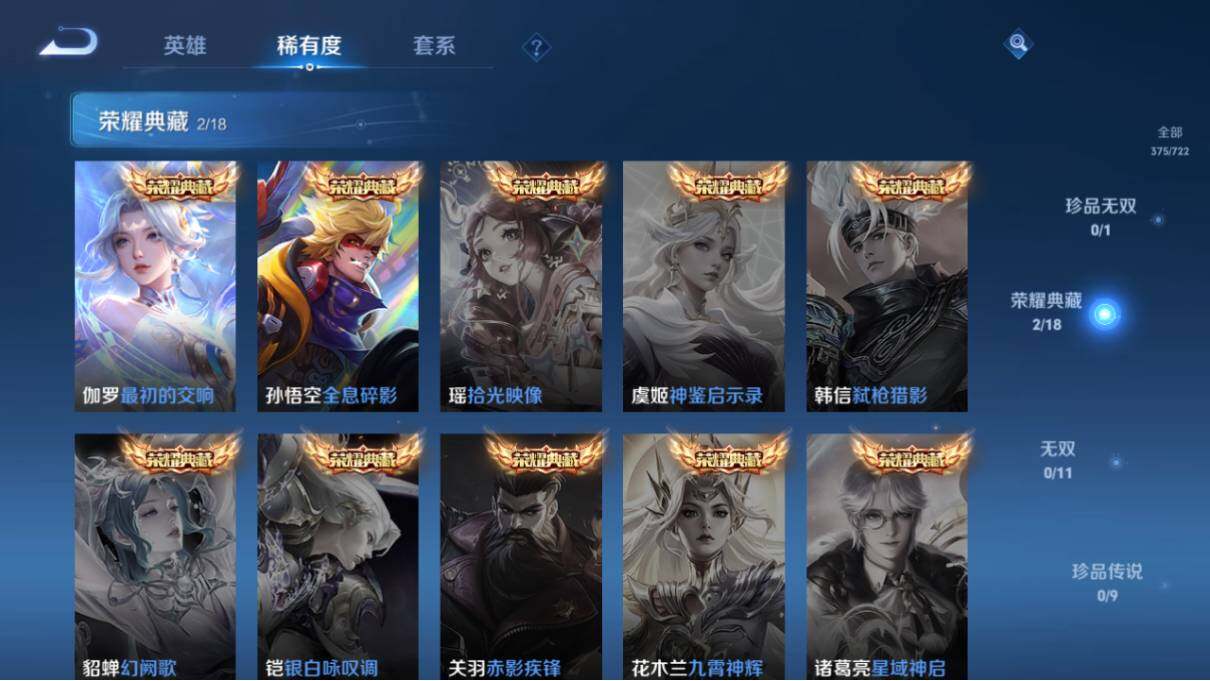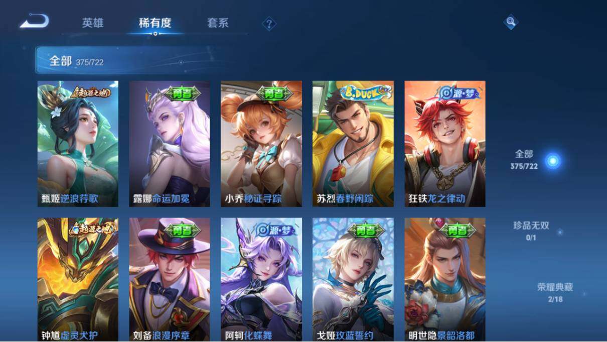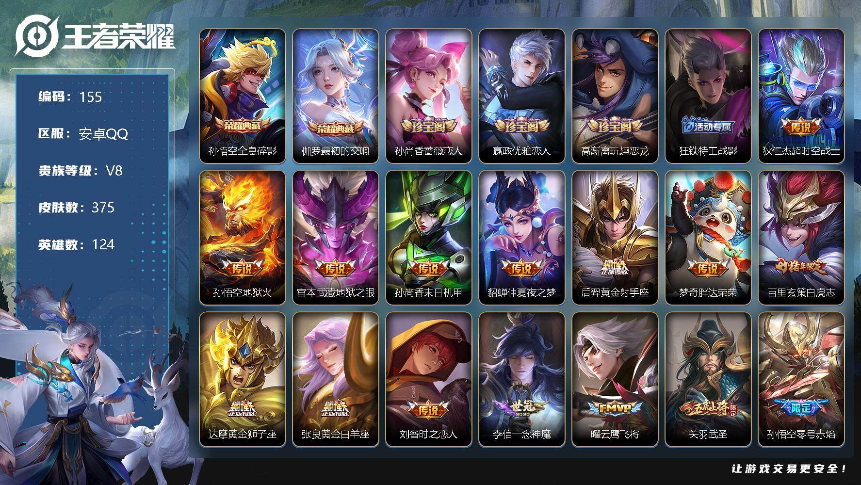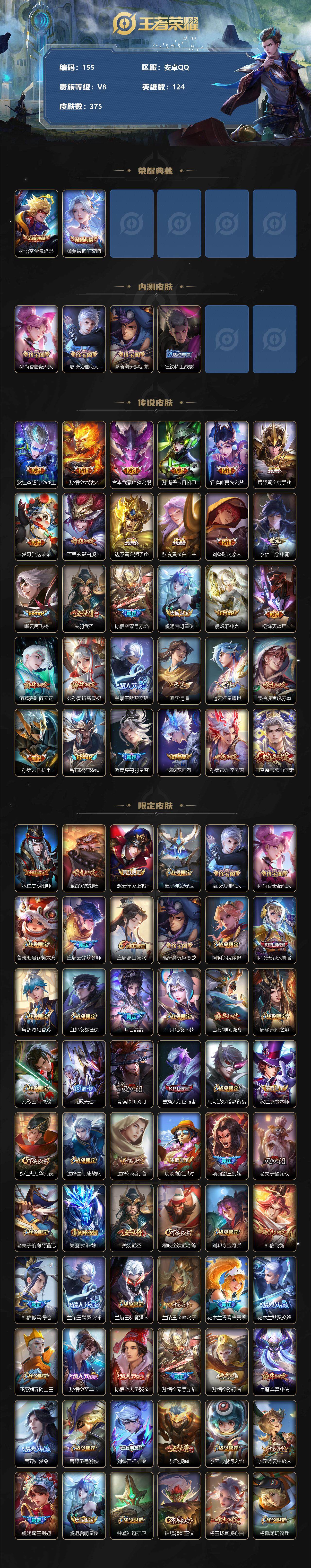 [10957685]【商品标题】:安卓Q-V8-最强王者段位-124英雄-375皮肤-2典藏-0珍品无双-0无双-0珍品传说-30传说-120史诗