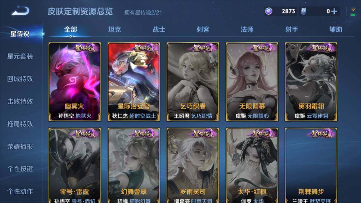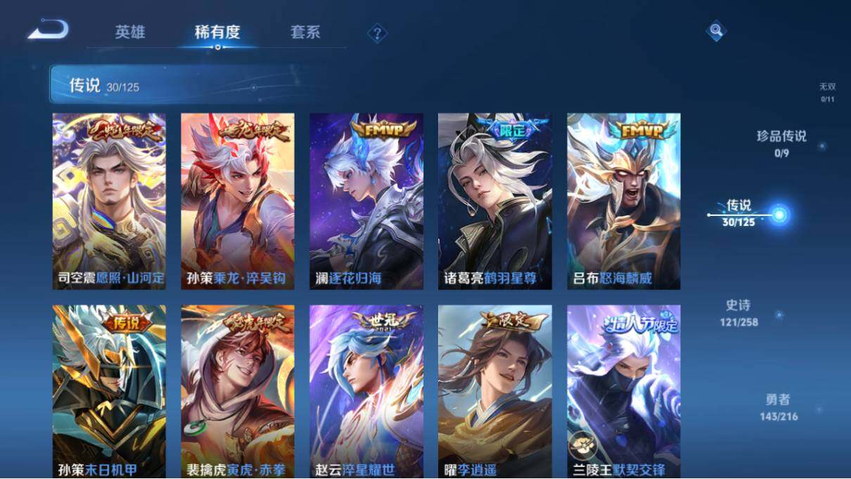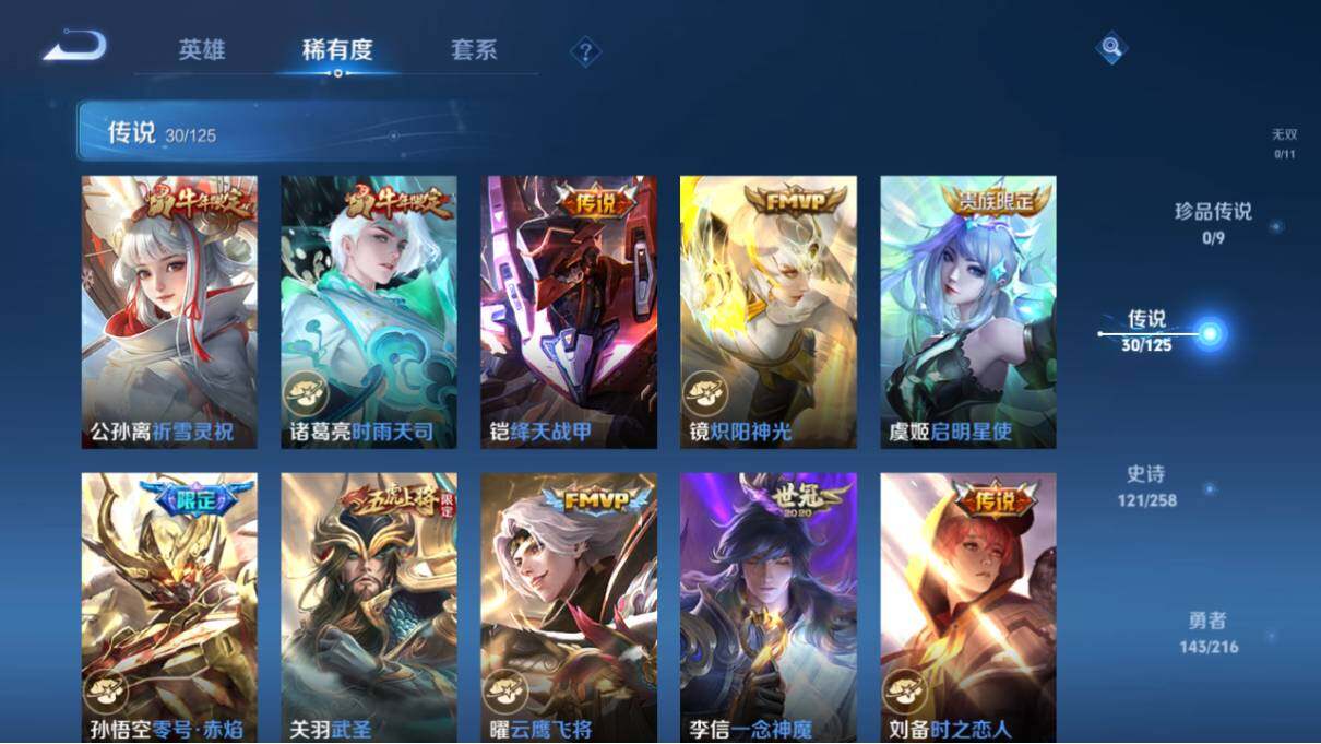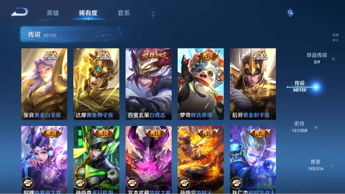 【传说皮肤】:狄仁杰超时空战士,孙悟空地狱火,宫本武藏地狱之眼,孙尚香末日机甲,貂蝉仲夏夜之梦,后羿黄金射手座,梦奇胖达荣荣,百里玄策白虎志,达摩黄金狮子座,张良黄金白羊座,刘备时之恋人,李信一念神魔,曜云鹰飞将,关羽武圣,孙悟空零号赤焰,虞姬启明星使,镜炽阳神光,铠绛天战甲,诸葛亮时雨天司,公孙离祈雪灵祝,兰陵王默契交锋,曜李逍遥 ,赵云淬星耀世,裴擒虎寅虎赤拳,孙策末日机甲,吕布怒海麟威,诸葛亮鹤羽星尊,澜逐花归海,孙策乘龙淬吴钩,司空震愿照山河定