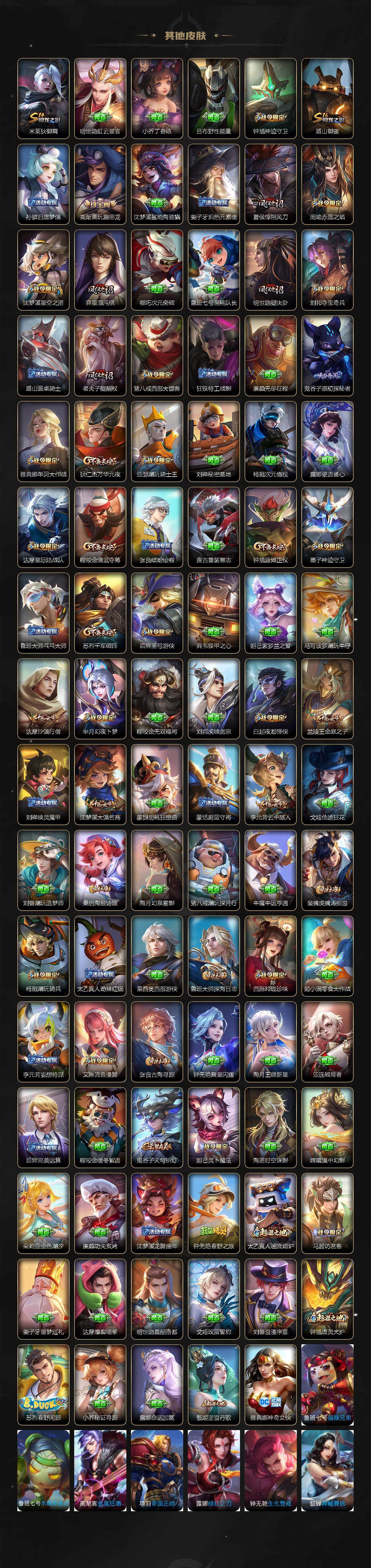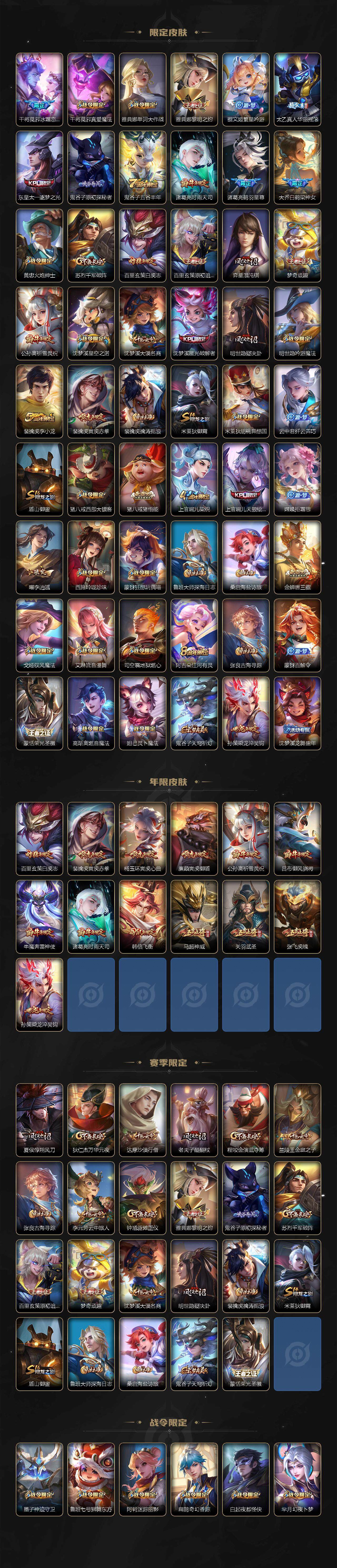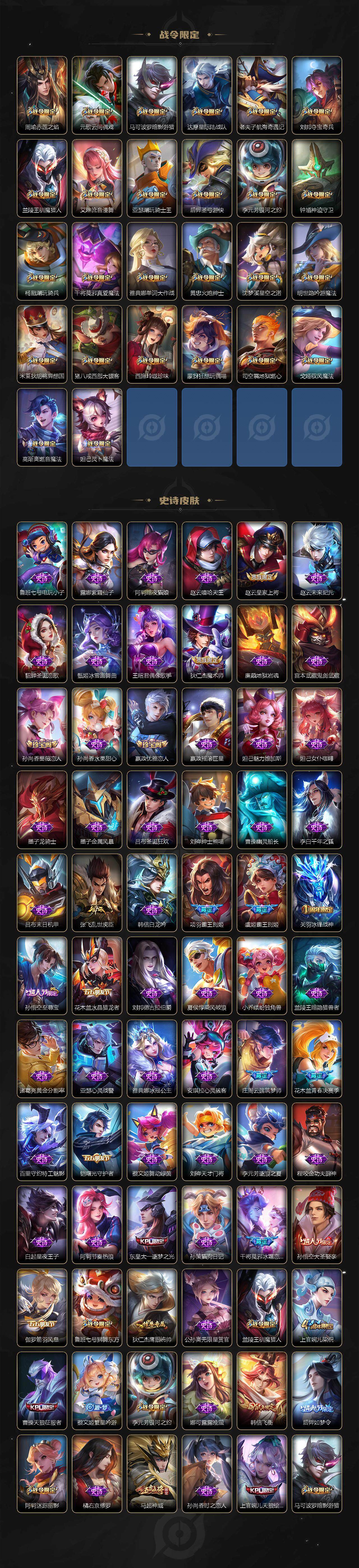 【限定皮肤】:狄仁杰阴阳师,廉颇寅虎御盾,赵云皇家上将,墨子神迹守卫,嬴政优雅恋人,孙尚香蔷薇恋人,鲁班七号狮舞东方,庄周云端筑梦师,庄周高山流水,高渐离玩趣恶龙,阿轲迷踪丽影,孙膑天狼运算者,扁鹊奇幻香踪,白起夜都怪侠,芈月白晶晶,芈月幻夜卜梦,吕布御风骁将,周瑜赤莲之焰,元歌云间偶戏,元歌无心,夏侯惇朔风刀,曹操天狼征服者,马可波罗暗影游猎,狄仁杰魔术师,狄仁杰万华元夜,达摩星际陆战队,达摩沙漠行僧,项羽海滩派对,项羽霸王别姬,老夫子醍醐杖,老夫子航海奇遇记,关羽冰锋战神,关羽武圣,程咬金演武夺筹,刘邦夺宝奇兵,韩信飞衡,韩信傲雪梅枪,兰陵王默契交锋,兰陵王驯魔猎人,兰陵王金庭之子,花木兰青春决赛季,花木兰默契交锋,亚瑟潮玩骑士王,孙悟空至尊宝,孙悟空大圣娶亲,孙悟空零号赤焰,孙悟空孙行者,牛魔奔雷神使,后羿如梦令,后羿圣弓游侠,刘备百相守梦,张飞虎魄,李元芳银河之约,李元芳云中旅人,虞姬霸王别姬,虞姬启明星使,钟馗神迹守卫,钟馗驱傩正仪,杨玉环寅虎心曲,杨戬潮玩骑兵,干将莫邪冰霜恋舞曲,干将莫邪真爱魔法,雅典娜单词大作战,雅典娜黎明之约,蔡文姬繁星吟游,太乙真人华丽摇滚,东皇太一逐梦之光,鬼谷子原初探秘者,鬼谷子五谷丰年,诸葛亮时雨天司,诸葛亮鹤羽星尊,大乔白鹤梁神女,黄忠火炮绅士,苏烈千军破阵,百里玄策白虎志,百里玄策原初追逐者,弈星混沌棋,梦奇顽趣,公孙离祈雪灵祝,沈梦溪星空之诺,沈梦溪大漠名商,沈梦溪匿光破解者,明世隐疑决卦,明世隐吟游魔法,裴擒虎李小龙,裴擒