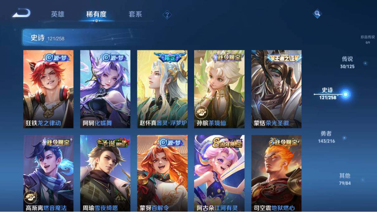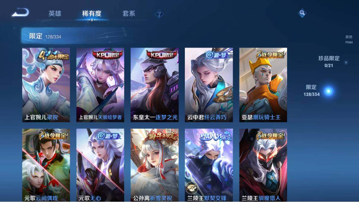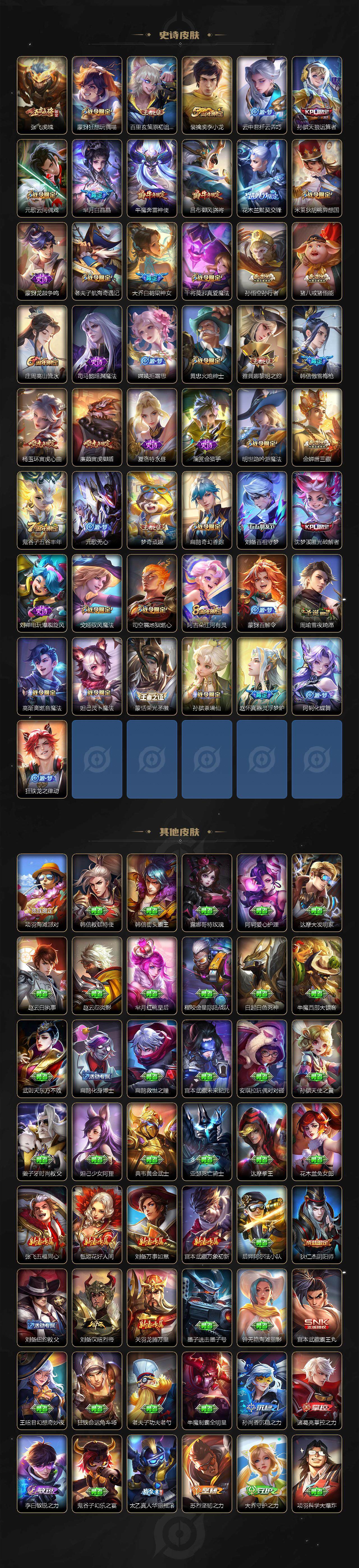 【限定皮肤】:狄仁杰阴阳师,廉颇寅虎御盾,赵云皇家上将,墨子神迹守卫,嬴政优雅恋人,孙尚香蔷薇恋人,鲁班七号狮舞东方,庄周云端筑梦师,庄周高山流水,高渐离玩趣恶龙,阿轲迷踪丽影,孙膑天狼运算者,扁鹊奇幻香踪,白起夜都怪侠,芈月白晶晶,芈月幻夜卜梦,吕布御风骁将,周瑜赤莲之焰,元歌云间偶戏,元歌无心,夏侯惇朔风刀,曹操天狼征服者,马可波罗暗影游猎,狄仁杰魔术师,狄仁杰万华元夜,达摩星际陆战队,达摩沙漠行僧,项羽海滩派对,项羽霸王别姬,老夫子醍醐杖,老夫子航海奇遇记,关羽冰锋战神,关羽武圣,程咬金演武夺筹,刘邦夺宝奇兵,韩信飞衡,韩信傲雪梅枪,兰陵王默契交锋,兰陵王驯魔猎人,兰陵王金庭之子,花木兰青春决赛季,花木兰默契交锋,亚瑟潮玩骑士王,孙悟空至尊宝,孙悟空大圣娶亲,孙悟空零号赤焰,孙悟空孙行者,牛魔奔雷神使,后羿如梦令,后羿圣弓游侠,刘备百相守梦,张飞虎魄,李元芳银河之约,李元芳云中旅人,虞姬霸王别姬,虞姬启明星使,钟馗神迹守卫,钟馗驱傩正仪,杨玉环寅虎心曲,杨戬潮玩骑兵,干将莫邪冰霜恋舞曲,干将莫邪真爱魔法,雅典娜单词大作战,雅典娜黎明之约,蔡文姬繁星吟游,太乙真人华丽摇滚,东皇太一逐梦之光,鬼谷子原初探秘者,鬼谷子五谷丰年,诸葛亮时雨天司,诸葛亮鹤羽星尊,大乔白鹤梁神女,黄忠火炮绅士,苏烈千军破阵,百里玄策白虎志,百里玄策原初追逐者,弈星混沌棋,梦奇顽趣,公孙离祈雪灵祝,沈梦溪星空之诺,沈梦溪大漠名商,沈梦溪匿光破解者,明世隐疑决卦,明世隐吟游魔法,裴擒虎李小龙,裴擒