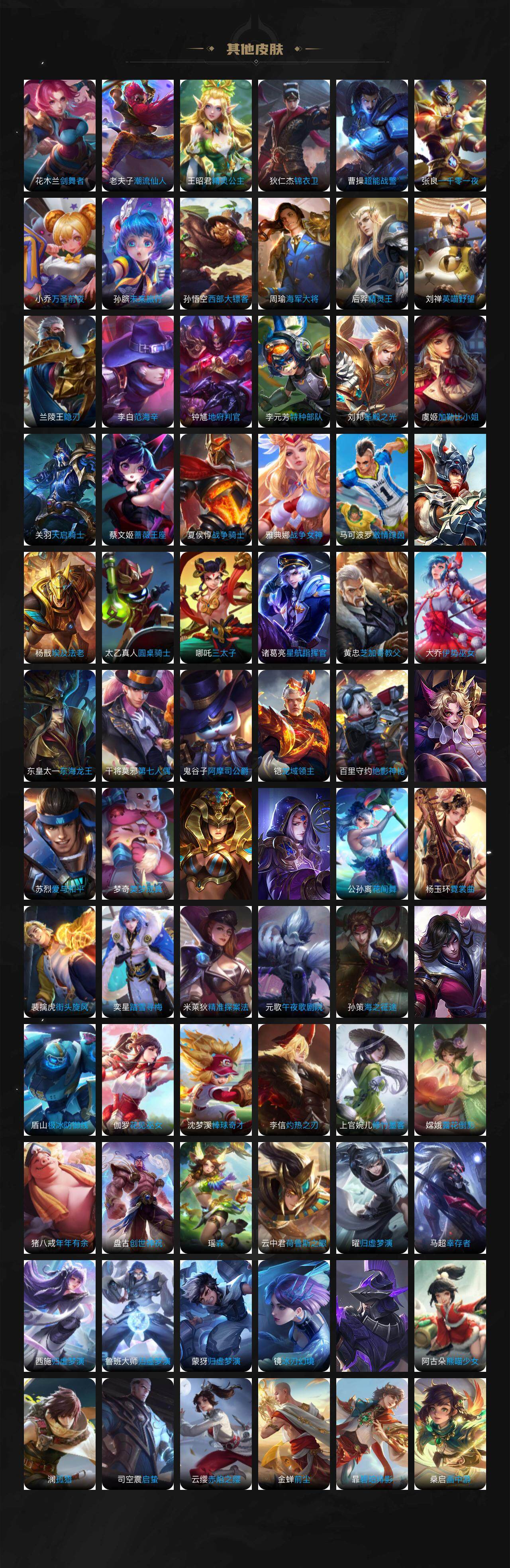 娜可露露晚萤,伽罗箭羽风息,李元芳逐浪之夏,公孙离无限星赏官,孙策猫狗日记,阿轲节奏热浪,露娜紫霞仙子,诸葛亮黄金分割率,王昭君偶像歌手,韩信白龙吟,孙尚香时之恋人,阿轲暗夜猫娘,雅典娜冰冠公主,吕布末日机甲,鲁班七号电玩小子,蒙犽龙鼓争鸣,橘右京修罗,墨子龙骑士,嬴政摇滚巨星,刘禅绅士熊喵,刘禅天才门将,白起星夜王子,安琪拉心灵骇客,程咬金功夫厨神,刘邦德古拉伯爵,兰陵王暗隐猎兽者,曹操幽灵船长,宫本武藏鬼剑武藏,司马懿暗渊魔法,亚瑟心灵战警,蔡文姬舞动绿茵,廉颇地狱岩魂,小乔缤纷独角兽,夏侯惇乘风破浪,花木兰水晶猎龙者,铠曙光守护者,墨子金属风暴,百里玄策原初追逐者,吕布圣诞狂欢,貂蝉圣诞恋歌,百里守约特工魅影,嫦娥拒霜思,雅典娜黎明之约,李白千年之狐,夏洛特永昼,澜赏金猎手,刘备百相守梦,沈梦溪匿光破解者,刘禅电玩·爆裂旋风,蒙犽百解令,周瑜雪夜绮愿,高渐离燃音魔法,赵怀真器灵·浮梦炉