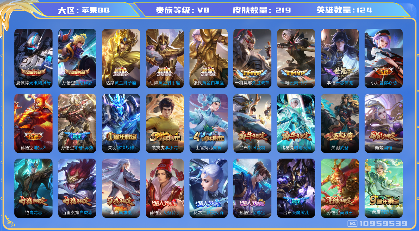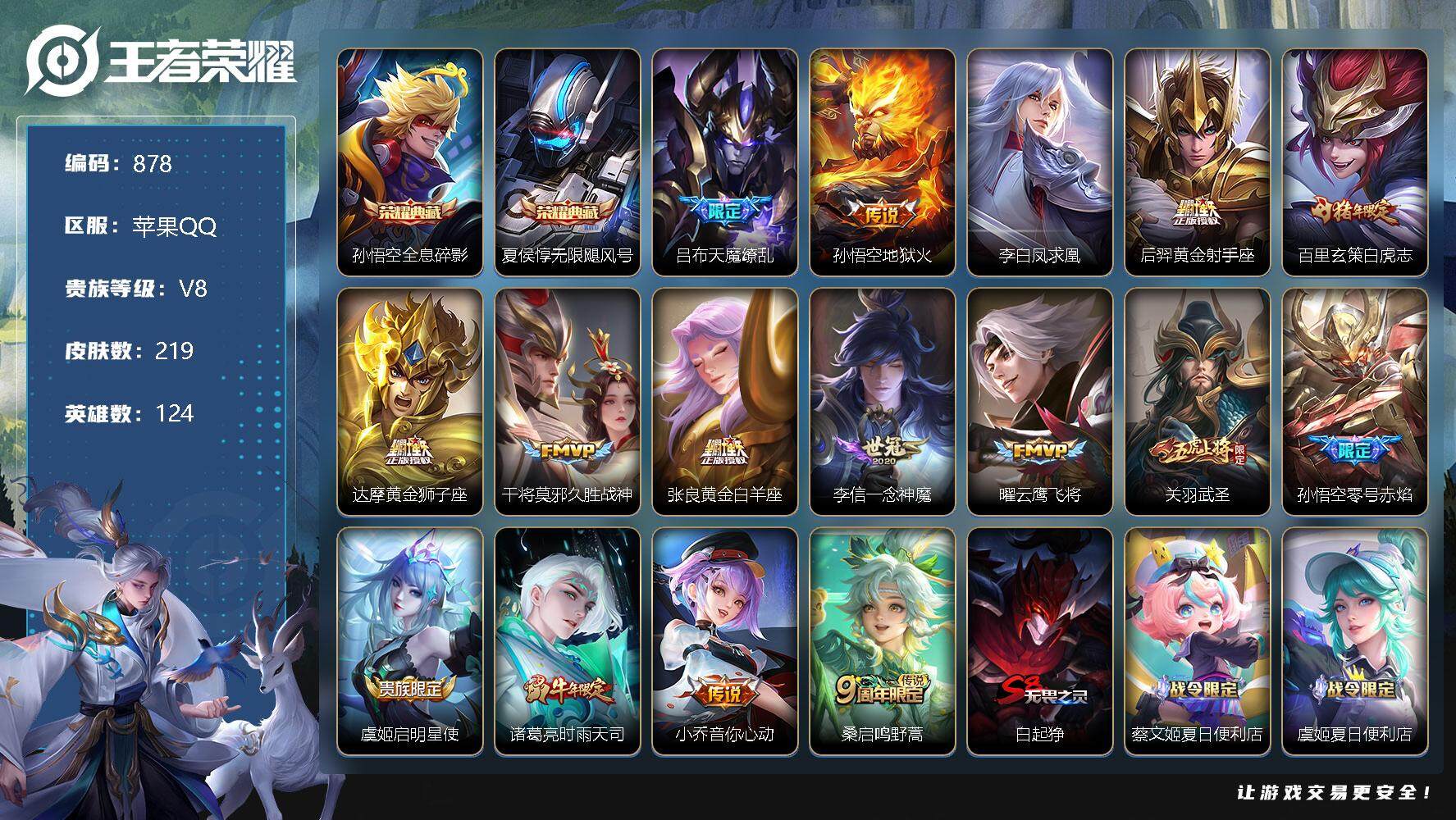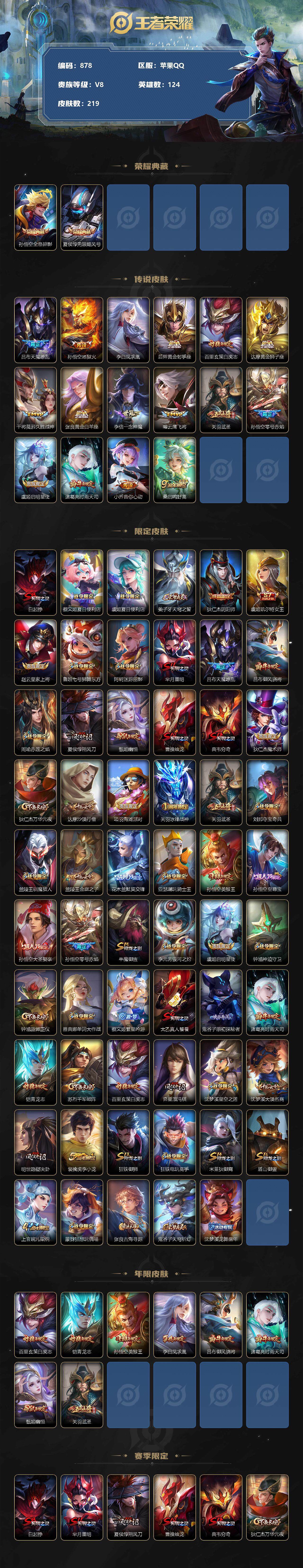 [10959539]【商品标题】:苹果Q-V7-永恒钻石III段位-124英雄-219皮肤-2典藏-0珍品无双-0无双-0珍品传说-16传说-58史诗