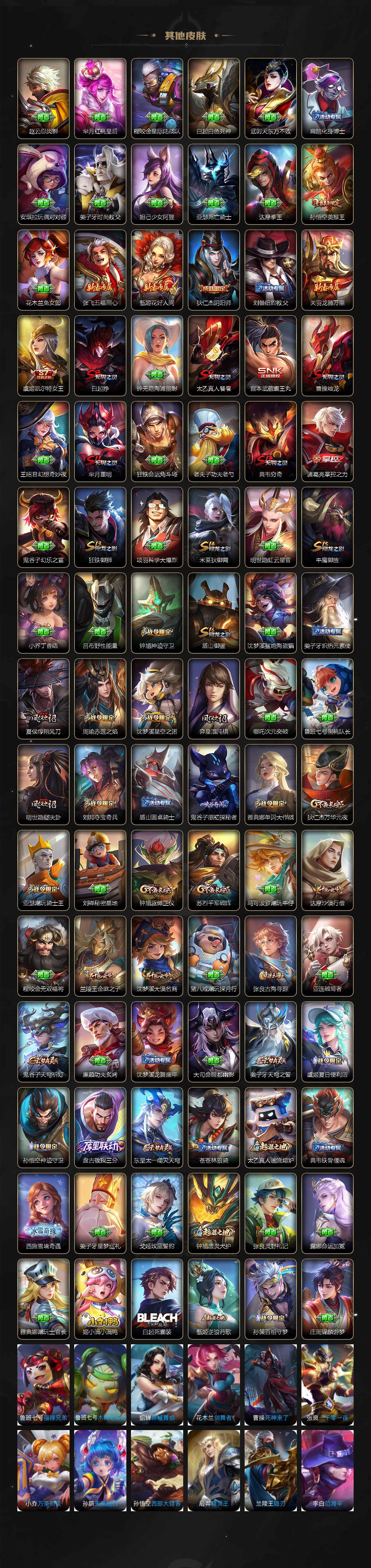 【限定皮肤】:白起狰,蔡文姬夏日便利店,虞姬夏日便利店,姜子牙天穹之誓,狄仁杰阴阳师,虞姬凯尔特女王,赵云皇家上将,鲁班七号狮舞东方,阿轲迷踪丽影,芈月重明,吕布天魔缭乱,吕布御风骁将,周瑜赤莲之焰,夏侯惇朔风刀,甄姬幽恒,曹操烛龙,典韦穷奇,狄仁杰魔术师,狄仁杰万华元夜,达摩沙漠行僧,项羽海滩派对,关羽冰锋战神,关羽武圣,刘邦夺宝奇兵,兰陵王驯魔猎人,兰陵王金庭之子,花木兰默契交锋,亚瑟潮玩骑士王,孙悟空美猴王,孙悟空至尊宝,孙悟空大圣娶亲,孙悟空零号赤焰,牛魔御旌,李元芳银河之约,虞姬启明星使,钟馗神迹守卫,钟馗驱傩正仪,雅典娜单词大作战,蔡文姬繁星吟游,太乙真人饕餮,鬼谷子原初探秘者,诸葛亮时雨天司,铠青龙志,苏烈千军破阵,百里玄策白虎志,弈星混沌棋,沈梦溪星空之诺,沈梦溪大漠名商,明世隐疑决卦,裴擒虎李小龙,狂铁御狮,狂铁电玩高手,米莱狄御霄,盾山御銮,上官婉儿梁祝,蒙犽狂想玩偶喵,张良古海寻踪,鬼谷子天穹祈灯,沈梦溪龙舞盛年