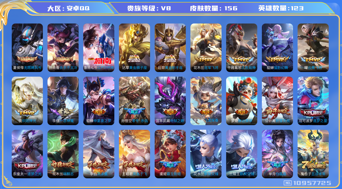 [10957725]【商品标题】:安卓Q-V8-最强王者段位-123英雄-156皮肤-2典藏-0珍品无双-0无双-1珍品传说-18传说-54史诗