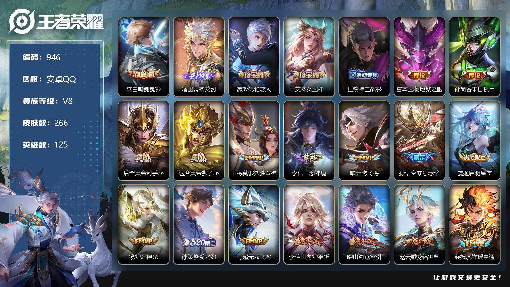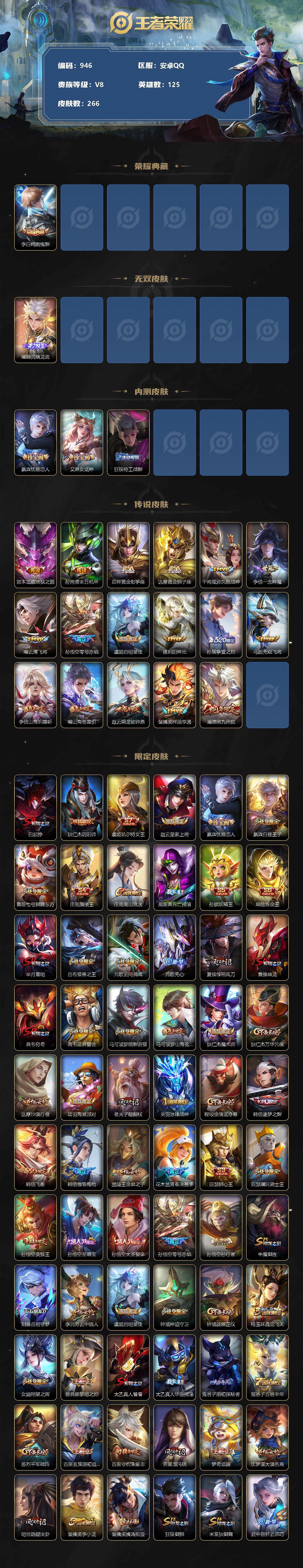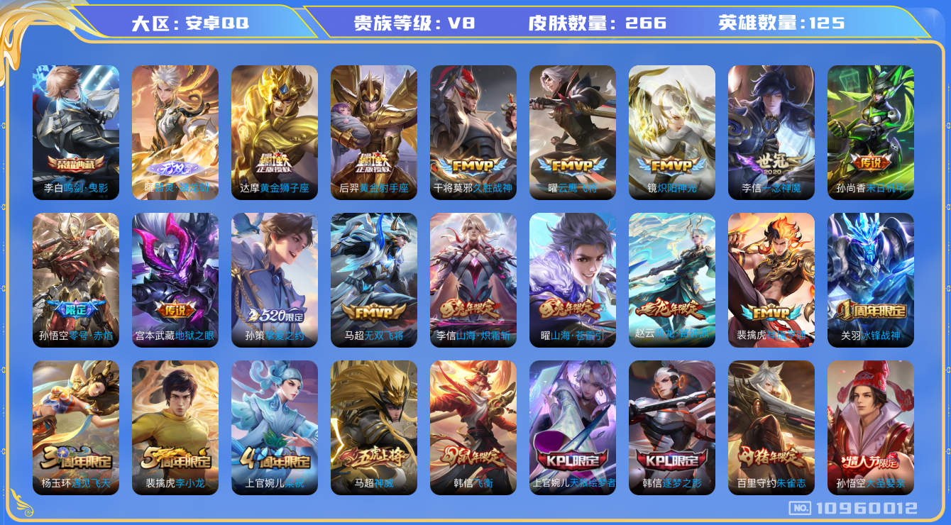 [10960012]【商品标题】:安卓Q-V8-至尊星耀V段位-125英雄-266皮肤-1典藏-0珍品无双-1无双-0珍品传说-17传说-69史诗