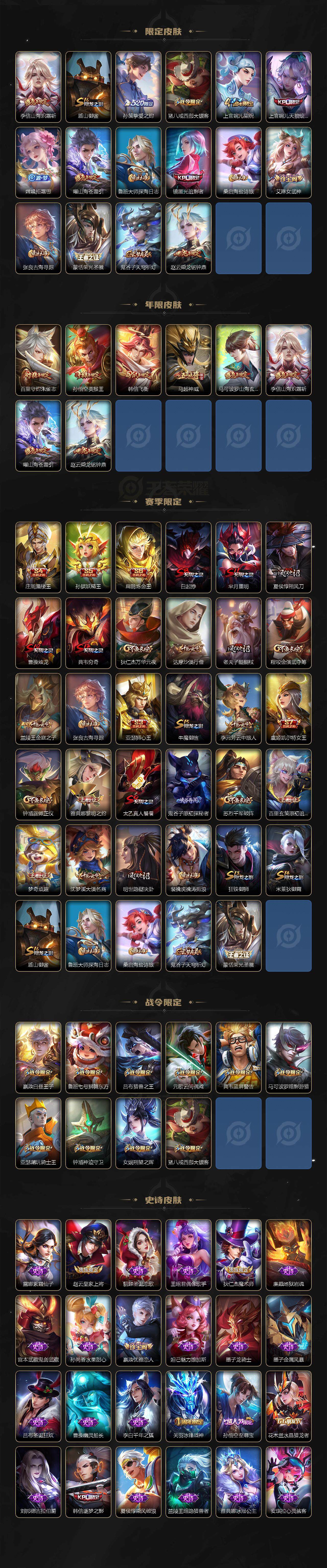 【限定皮肤】:白起狰,狄仁杰阴阳师,虞姬凯尔特女王,赵云皇家上将,嬴政优雅恋人,嬴政白昼王子,鲁班七号狮舞东方,庄周蜃楼王,庄周高山流水,高渐离死亡摇滚,孙膑妖精王,扁鹊炼金王,芈月重明,吕布猎兽之王,元歌云间偶戏,元歌无心,夏侯惇朔风刀,曹操烛龙,典韦穷奇,典韦蓝屏警告,马可波罗暗影游猎,马可波罗山海玄木吟,狄仁杰魔术师,狄仁杰万华元夜,达摩沙漠行僧,项羽海滩派对,老夫子醍醐杖,关羽冰锋战神,程咬金演武夺筹,韩信逐梦之影,韩信飞衡,韩信傲雪梅枪,兰陵王金庭之子,花木兰青春决赛季,亚瑟狮心王,亚瑟潮玩骑士王,孙悟空美猴王,孙悟空至尊宝,孙悟空大圣娶亲,孙悟空零号赤焰,孙悟空孙行者,牛魔御旌,刘备百相守梦,李元芳云中旅人,虞姬启明星使,钟馗神迹守卫,钟馗驱傩正仪,杨玉环遇见飞天,女娲朔望之晖,雅典娜黎明之约,太乙真人饕餮,太乙真人华丽摇滚,鬼谷子原初探秘者,鬼谷子五谷丰年,苏烈千军破阵,百里玄策原初追逐者,百里守约朱雀志,弈星混沌棋,梦奇顽趣,沈梦溪大漠名商,明世隐疑决卦,裴擒虎李小龙,裴擒虎擒涛扼浪,狂铁御狮,米莱狄御霄,云中君纤云弄巧,李信山海炽霜斩,盾山御銮,孙策挚爱之约,猪八戒西部大镖客,上官婉儿梁祝,上官婉儿天狼绘梦者,嫦娥拒霜思,曜山海苍雷引,鲁班大师探海日志,镜匿光追影者,桑启海盐诗旅,艾琳女武神,张良古海寻踪,蒙恬荣光圣徽,鬼谷子天穹祈灯,赵云乘龙铭钟鼎