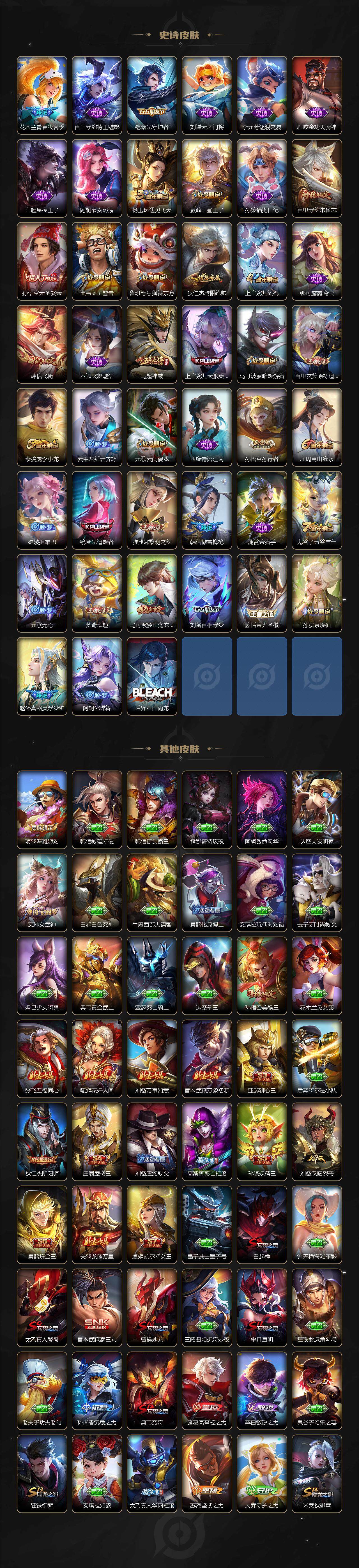 - PX_2101653-/皮肤216/典藏1/传说8/史诗57/英雄125/鸣剑曳影/幽冥之眼/曜器灵螭龙剑/蔷薇恋人/特工战影/云鹰飞将/炽阳神光/李逍遥/山海苍雷引/炽翼辉光/逐花归海/曦玄引貂蝉/桑启鸣野蒿/蒙犽顽岩魄/蔡文姬夏日便利店/大乔绒语心约/虞姬夏日便利店/姜子牙天穹之誓/李白谪仙醉月/狄仁杰阴阳师/赵云皇家上将/蔷薇恋人/钟无艳超时空战士/扁鹊奇幻香踪/元歌无心/甄姬落雪兰心/狄仁
