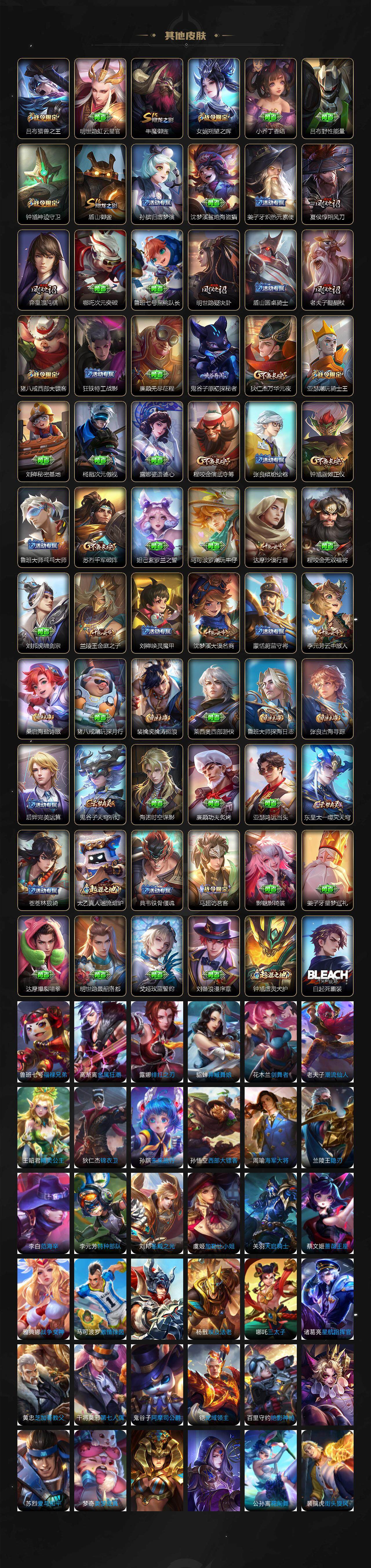 亚瑟狮心王,庄周蜃楼王,孙膑妖精王,扁鹊炼金王,虞姬凯尔特女王,白起狰,太乙真人饕餮,曹操烛龙,芈月重明,典韦穷奇,狂铁御狮,米莱狄御霄,牛魔御旌,盾山御銮,夏侯惇朔风刀,明世隐疑决卦,老夫子醍醐杖,鬼谷子原初探秘者,狄仁杰万华元夜,程咬金演武夺筹,钟馗驱傩正仪,苏烈千军破阵,吕布猎兽之王,嬴政白昼王子,女娲朔望之晖,典韦蓝屏警告,钟馗神迹守卫,鲁班七号狮舞东方,马可波罗暗影游猎,元歌云间偶戏,弈星混沌棋,达摩沙漠行僧,兰陵王金庭之子,沈梦溪大漠名商,李元芳云中旅人,桑启海盐诗旅,裴擒虎擒涛扼浪,鲁班大师探海日志,张良古海寻踪