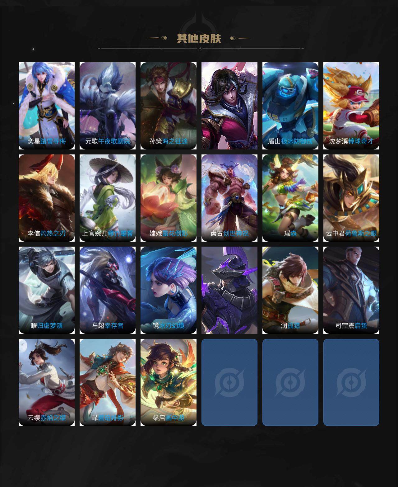 关羽冰锋战神,裴擒虎李小龙,上官婉儿梁祝,马超神威,韩信飞衡,上官婉儿天狼绘梦者,韩信逐梦之影,百里守约朱雀志,孙悟空大圣娶亲,孙悟空至尊宝,花木兰青春决赛季,孙悟空美猴王,孙悟空孙行者,镜匿光追影者,韩信傲雪梅枪,马可波罗山海·玄木吟,澜愿照·九州拓