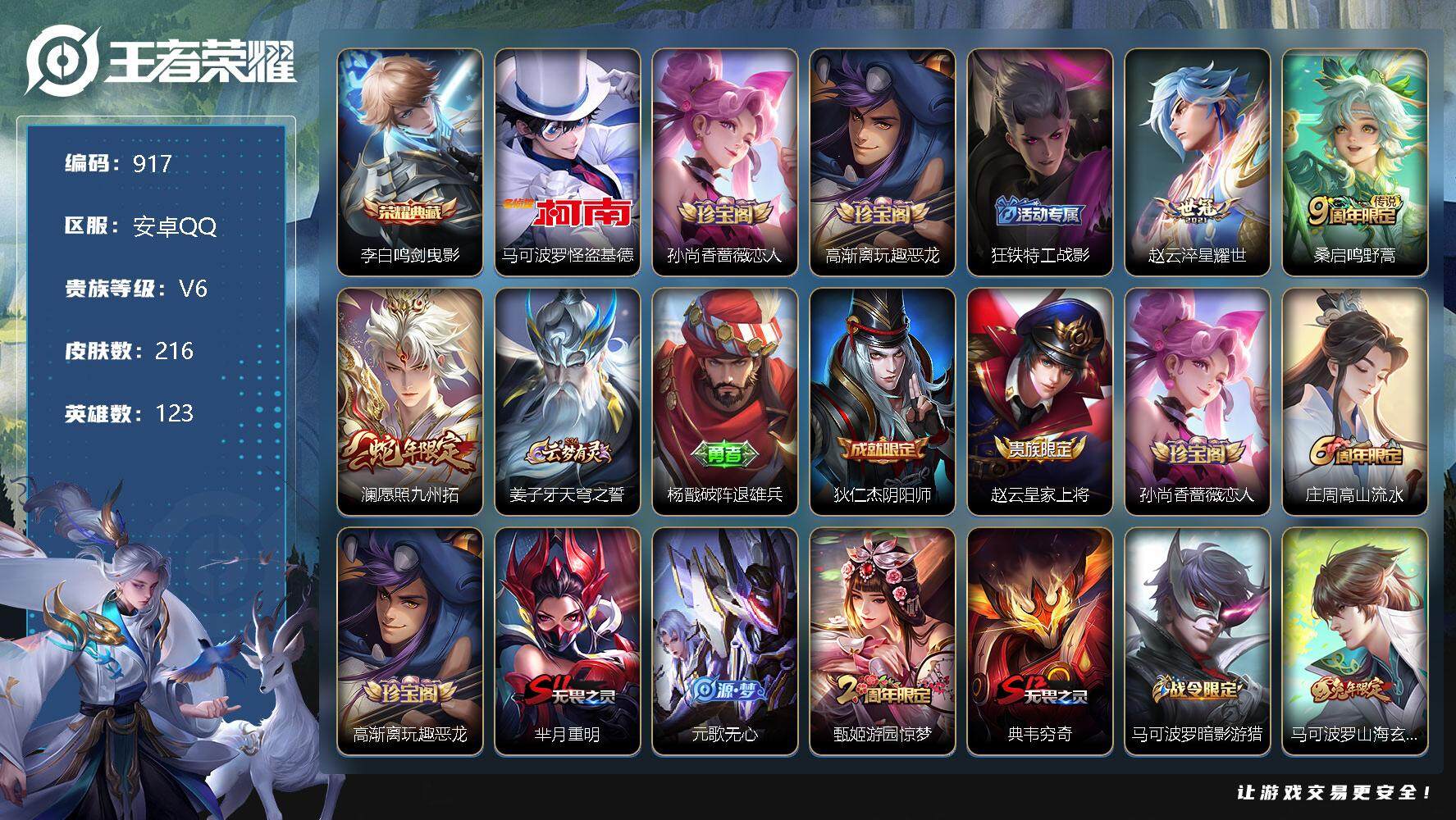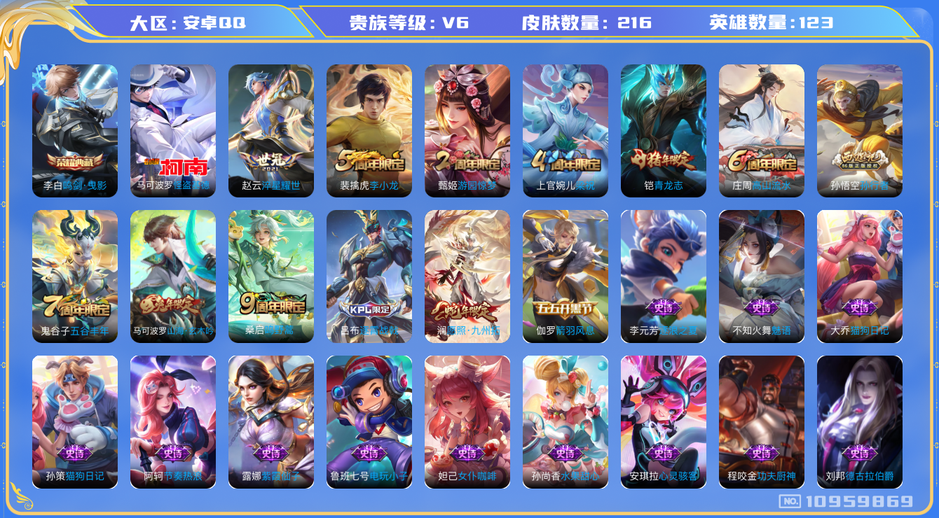 [10959869]【商品标题】:安卓Q-V4-至尊星耀II段位-123英雄-216皮肤-1典藏-0珍品无双-0无双-1珍品传说-3传说-57史诗