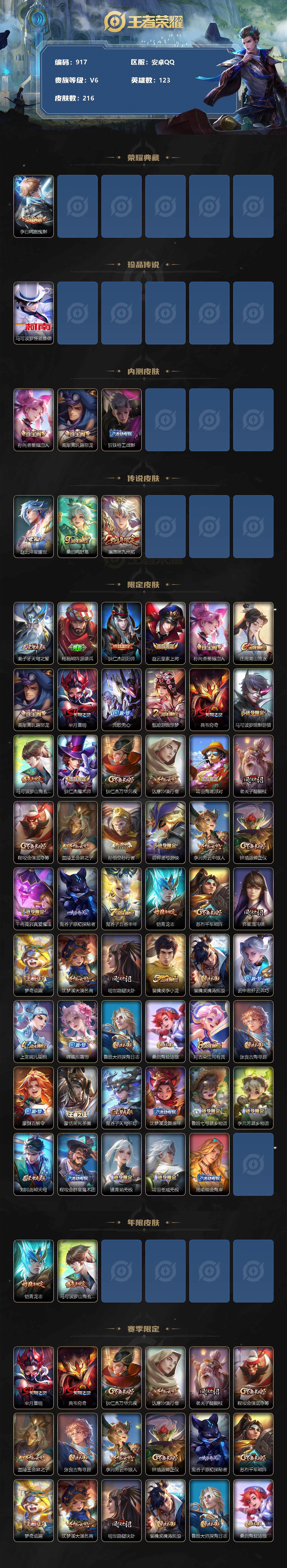 【限定皮肤】:姜子牙天穹之誓,杨戬破阵退雄兵,狄仁杰阴阳师,赵云皇家上将,孙尚香蔷薇恋人,庄周高山流水,高渐离玩趣恶龙,芈月重明,元歌无心,甄姬游园惊梦,典韦穷奇,马可波罗暗影游猎,马可波罗山海玄木吟,狄仁杰魔术师,狄仁杰万华元夜,达摩沙漠行僧,项羽海滩派对,老夫子醍醐杖,程咬金演武夺筹,兰陵王金庭之子,孙悟空孙行者,后羿圣弓游侠,李元芳云中旅人,钟馗驱傩正仪,干将莫邪真爱魔法,鬼谷子原初探秘者,鬼谷子五谷丰年,铠青龙志,苏烈千军破阵,弈星混沌棋,梦奇顽趣,沈梦溪大漠名商,明世隐疑决卦,裴擒虎李小龙,裴擒虎擒涛扼浪,云中君纤云弄巧,上官婉儿梁祝,嫦娥拒霜思,鲁班大师探海日志,桑启海盐诗旅,阿古朵江河有灵,张良古海寻踪,蒙犽百解令,蒙恬荣光圣徽,鬼谷子天穹祈灯,沈梦溪龙舞盛年,鲁班七号蔬乡物语,李元芳蔬乡物语,刘邦剑破天穹,程咬金群星魔术团,镜青焰无极,项羽苍威无极,周瑜熔金海岸