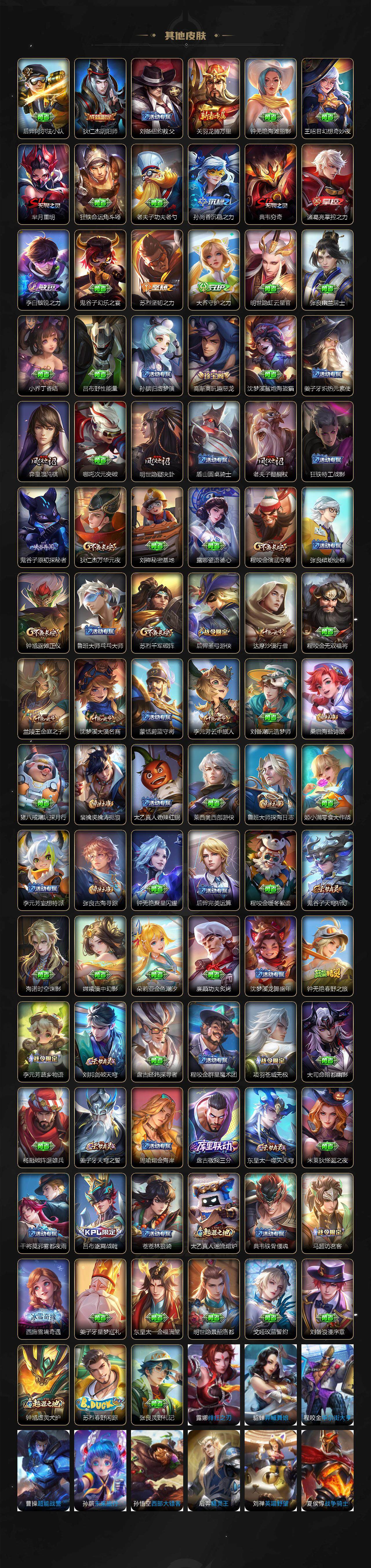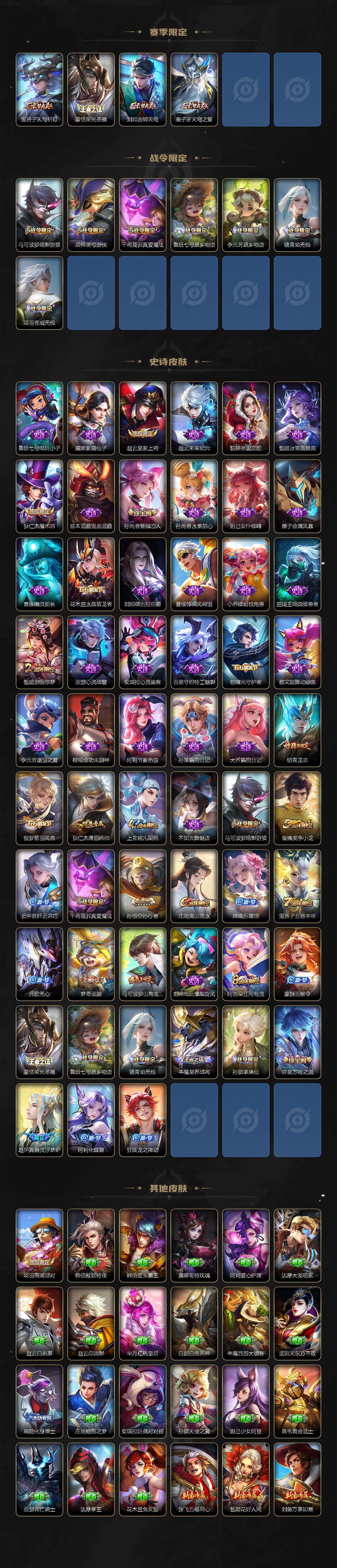 【赛季限定】:芈月重明,典韦穷奇,狄仁杰万华元夜,达摩沙漠行僧,老夫子醍醐杖,程咬金演武夺筹,兰陵王金庭之子,张良古海寻踪,李元芳云中旅人,钟馗驱傩正仪,鬼谷子原初探秘者,苏烈千军破阵,弈星混沌棋,梦奇顽趣,沈梦溪大漠名商,明世隐疑决卦,裴擒虎擒涛扼浪,鲁班大师探海日志,桑启海盐诗旅,鬼谷子天穹祈灯,蒙恬荣光圣徽,刘邦剑破天穹,姜子牙天穹之誓