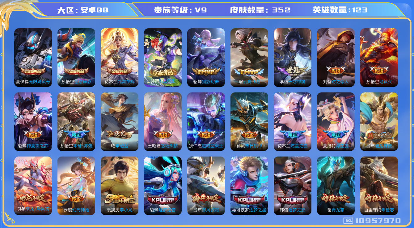 [10957970]【商品标题】:安卓Q-V9-尊贵铂金I段位-123英雄-352皮肤-3典藏-0珍品无双-0无双-1珍品传说-20传说-105史诗