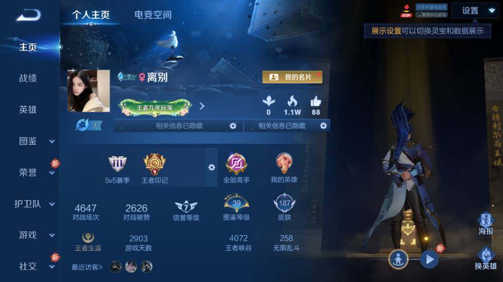 - [12058258]V7 1典藏 5传说 120英雄 188皮肤 可修改实名 优质装备:幻阙歌(貂蝉典藏),澜逐花归海,千山共赴,涂山容容 传说皮:幻光神枪 珍宝阁皮:胡桃夹子 限定皮:愿照·千秋盛(女娲年限),逐霄战戟,鸣野蒿,梁祝 史诗皮:化蝶舞,星界战将,龙之律动,百相守梦-周瑜,茶境仙,上官婉儿群星魔术团,蔬乡物语(鲁班七号),紫霞仙子,特工魅影,江河有灵,魅语,高渐离燃音魔法,蒙恬荣光圣徽,偶像歌手,乱世虎臣,节奏热浪,女仆咖啡,水果甜心,天才门将,星夜王子,功夫厨神,德古拉伯爵,暗隐猎兽者,幽灵船长,鬼剑武藏,心灵战警,地狱岩魂,逐浪之夏,水晶猎龙者,曙光守护者,唤灵魅影,金属风暴,圣诞恋歌,鹰眼统帅,魅力维加斯,黎明之约