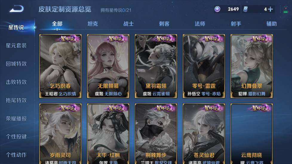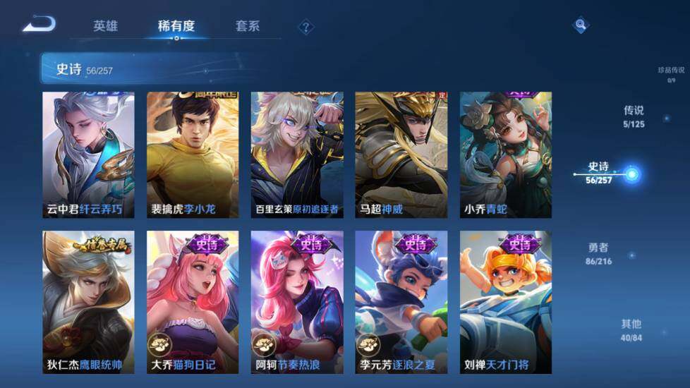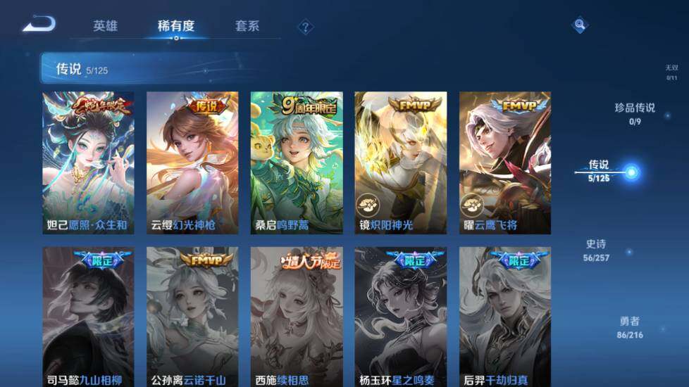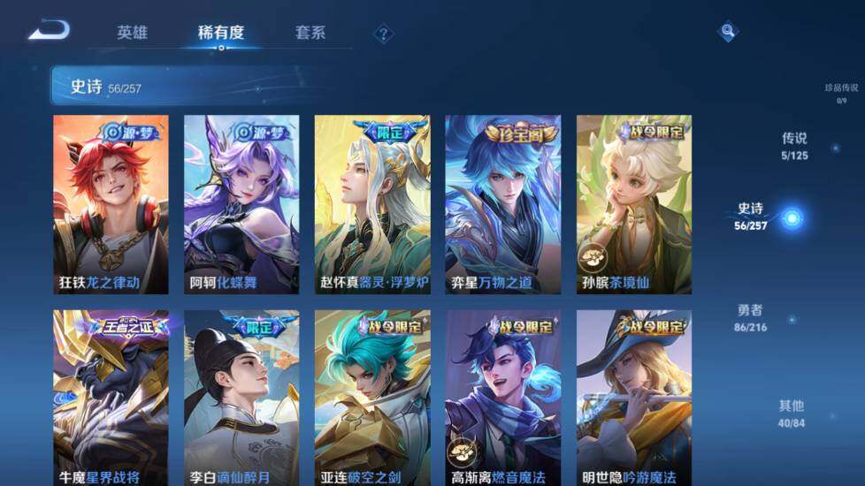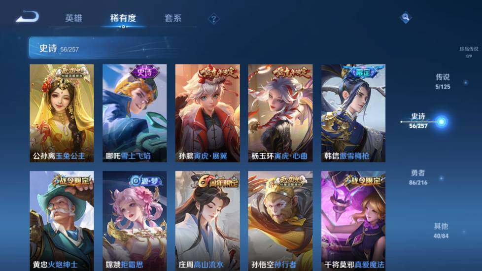 - [12174050]猴子典藏,久胜,紫霞,-可二次-108英雄-165皮肤-1典藏-7传说-31史诗 辉光之辰-后羿 街头霸王-韩信