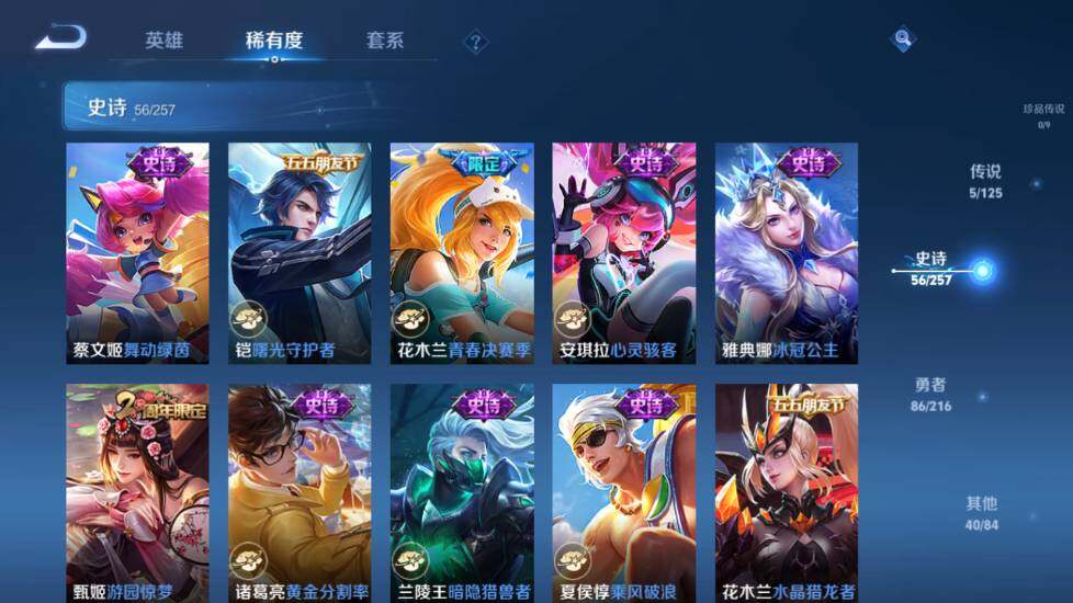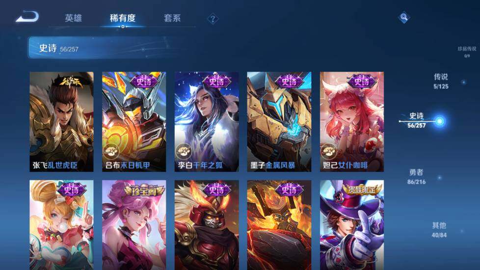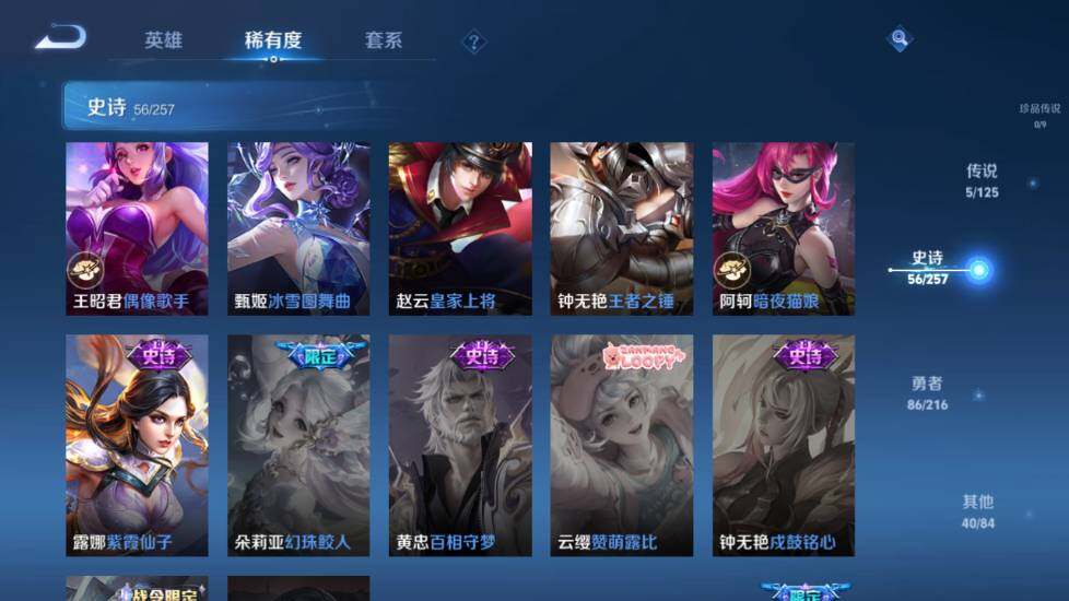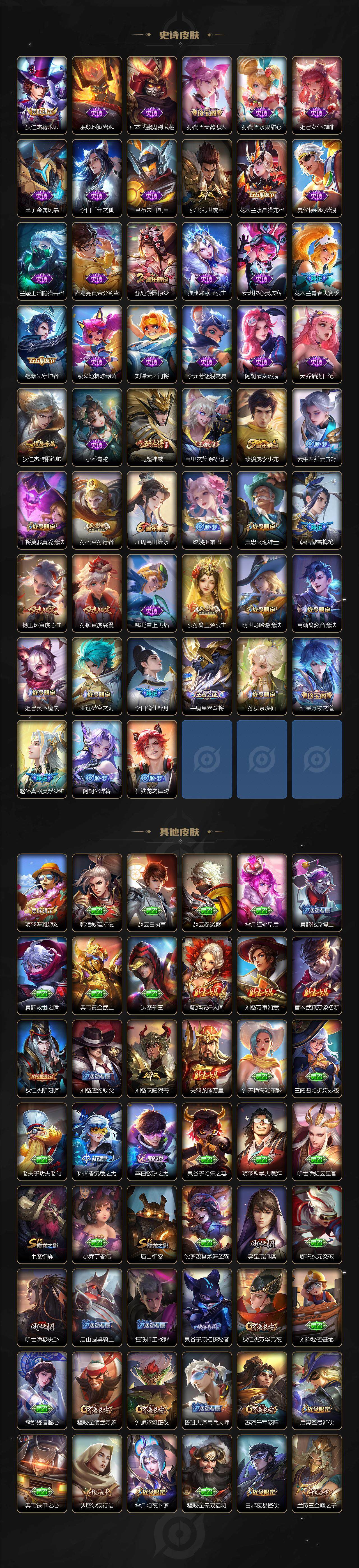 【史诗皮肤】:露娜紫霞仙子,阿轲暗夜猫娘,钟无艳王者之锤,赵云皇家上将,甄姬冰雪圆舞曲,王昭君偶像歌手,狄仁杰魔术师,廉颇地狱岩魂,宫本武藏鬼剑武藏,孙尚香蔷薇恋人,孙尚香水果甜心,妲己女仆咖啡,墨子金属风暴,李白千年之狐,吕布末日机甲,张飞乱世虎臣,花木兰水晶猎龙者,夏侯惇乘风破浪,兰陵王暗隐猎兽者,诸葛亮黄金分割率,甄姬游园惊梦,雅典娜冰冠公主,安琪拉心灵骇客,花木兰青春决赛季,铠曙光守护者,蔡文姬舞动绿茵,刘禅天才门将,李元芳逐浪之夏,阿轲节奏热浪,大乔猫狗日记,狄仁杰鹰眼统帅,小乔青蛇,马超神威,百里玄策原初追逐者,裴擒虎李小龙,云中君纤云弄巧,干将莫