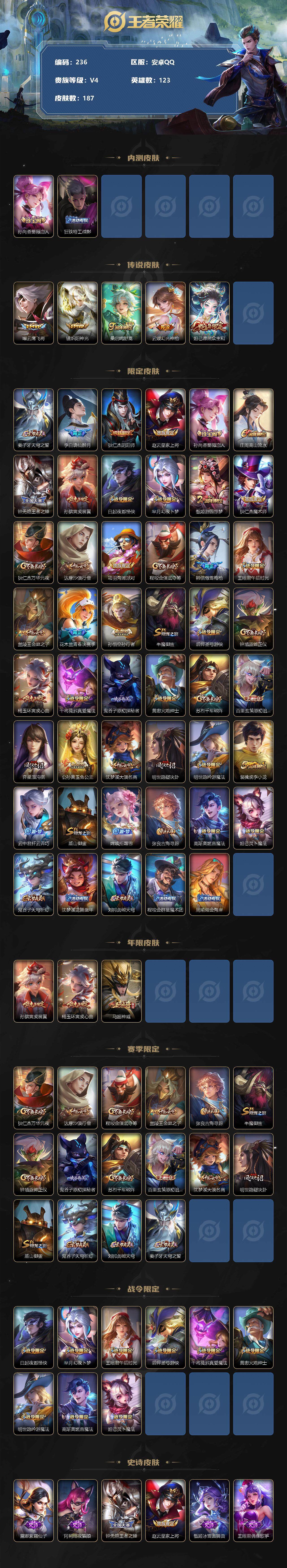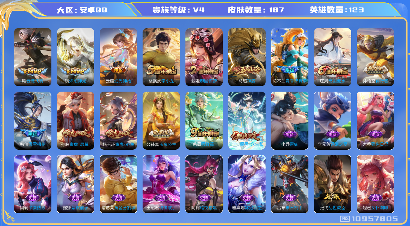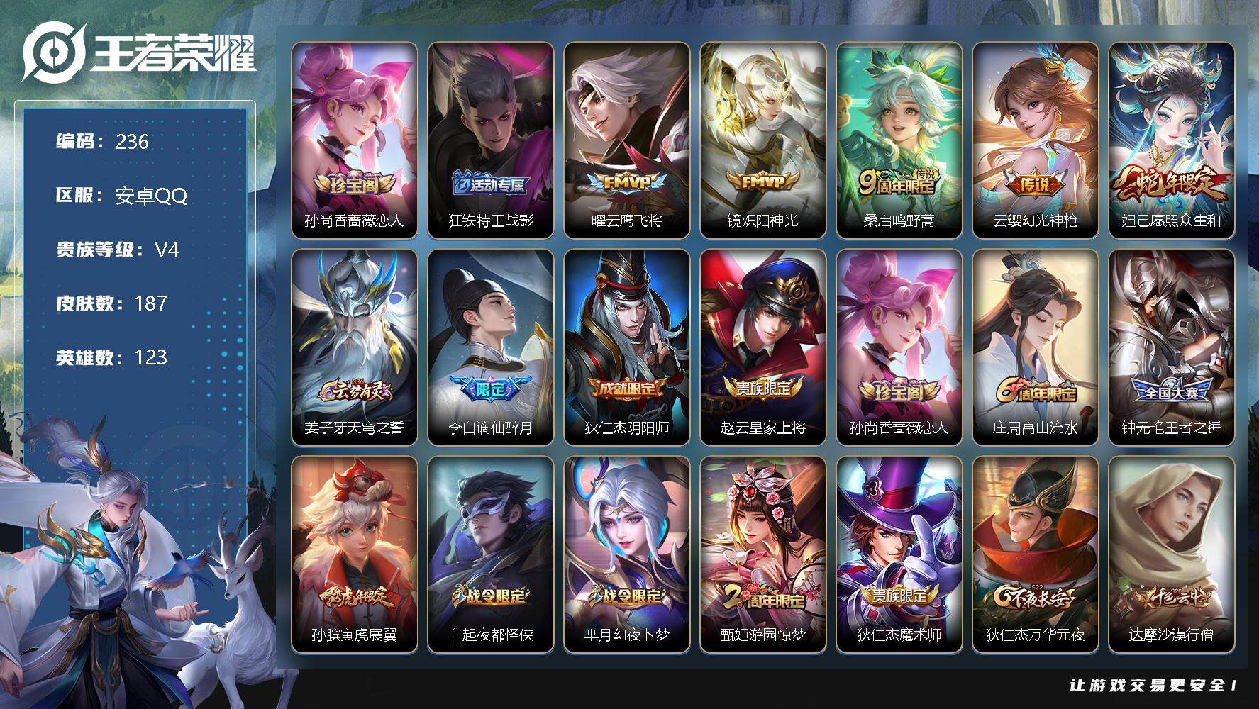 [10957805]【商品标题】:安卓Q-V4-永恒钻石IV段位-123英雄-187皮肤-0典藏-0珍品无双-0无双-0珍品传说-5传说-56史诗