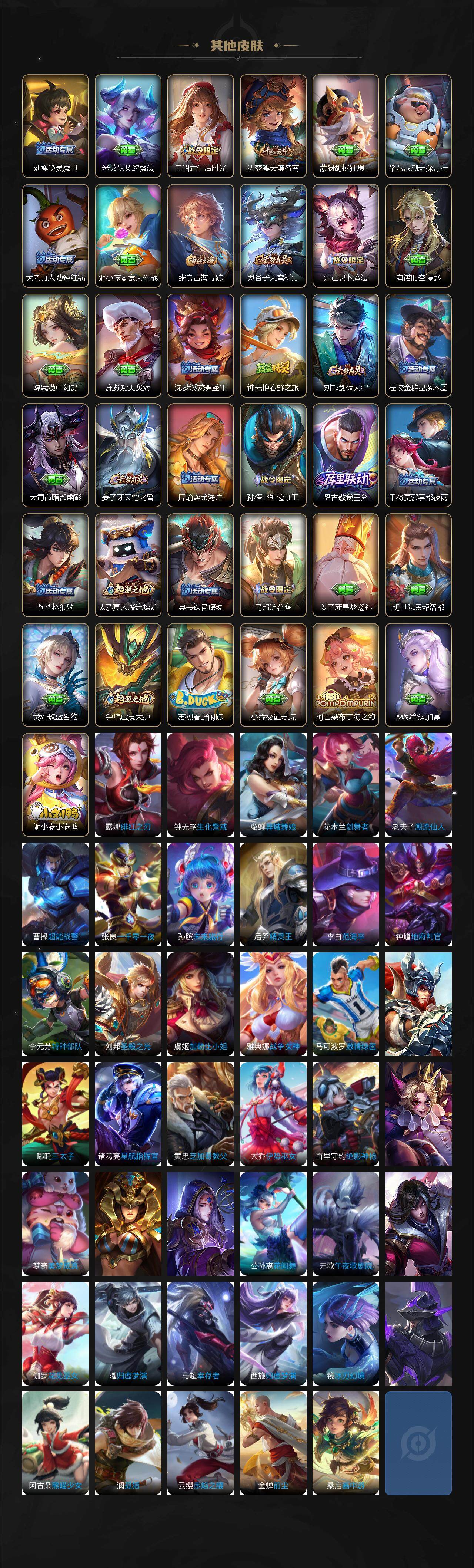 【限定皮肤】:姜子牙天穹之誓,李白谪仙醉月,狄仁杰阴阳师,赵云皇家上将,孙尚香蔷薇恋人,庄周高山流水,钟无艳王者之锤,孙膑寅虎展翼,白起夜都怪侠,芈月幻夜卜梦,甄姬游园惊梦,狄仁杰魔术师,狄仁杰万华元夜,达摩沙漠行僧,项羽海滩派对,程咬金演武夺筹,韩信傲雪梅枪,王昭君午后时光,兰陵王金庭之子,花木兰青春决赛季,孙悟空孙行者,牛魔御旌,后羿圣弓游侠,钟馗驱傩正仪,杨玉环寅虎心曲,干将莫邪真爱魔法,鬼谷子原初探秘者,黄忠火炮绅士,苏烈千军破阵,百里玄策原初追逐者,弈星混沌棋,公孙离玉兔公主,沈梦溪大漠名商,明世隐疑决卦,明世隐吟游魔法,裴擒虎李小龙,云中君纤云弄巧,盾山御銮,嫦娥拒霜思,张良古海寻踪,高渐离燃音魔法,妲己灵卜魔法,鬼谷子天穹祈灯,沈梦溪龙舞盛年,刘邦剑破天穹,程咬金群星魔术团,周瑜熔金海岸