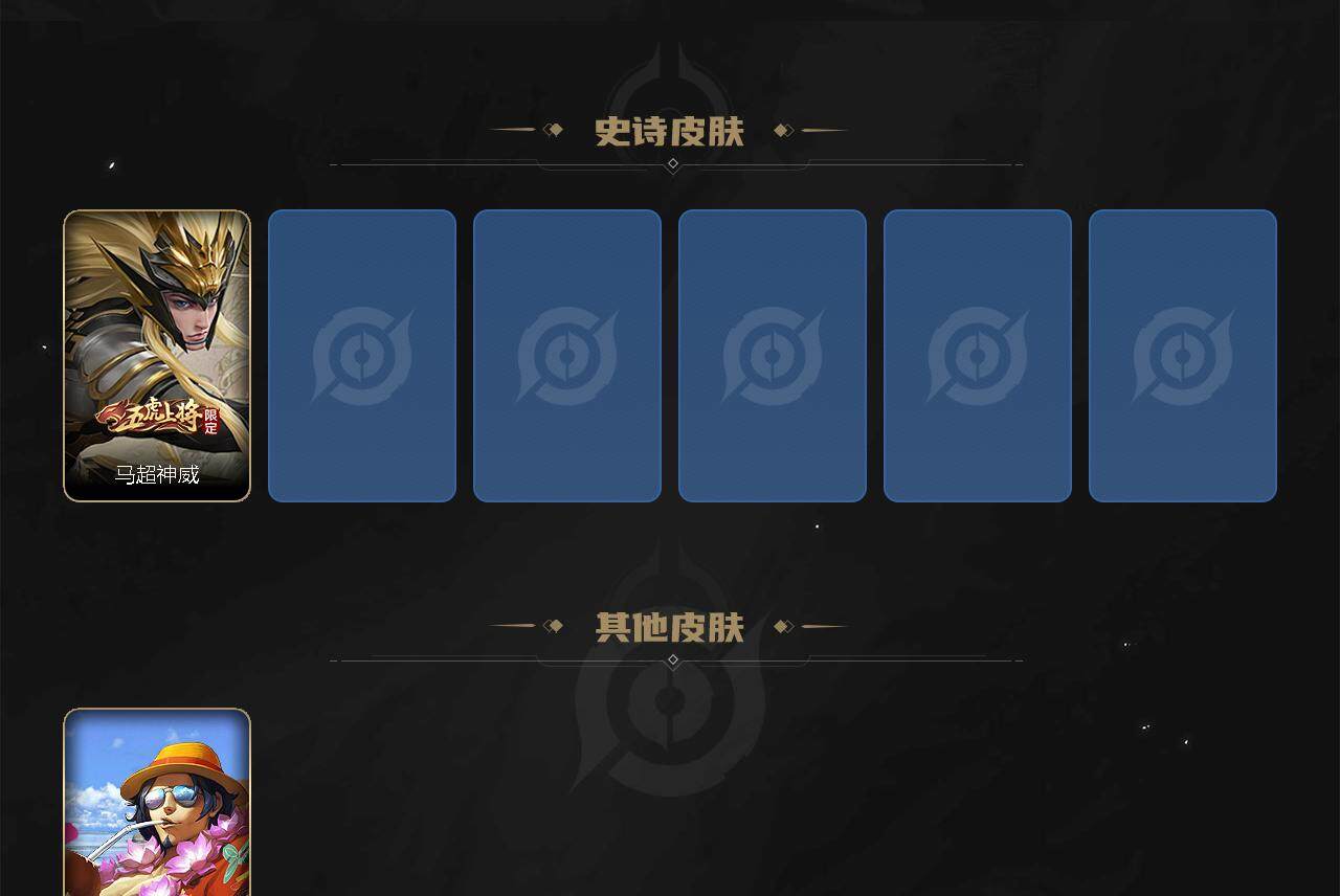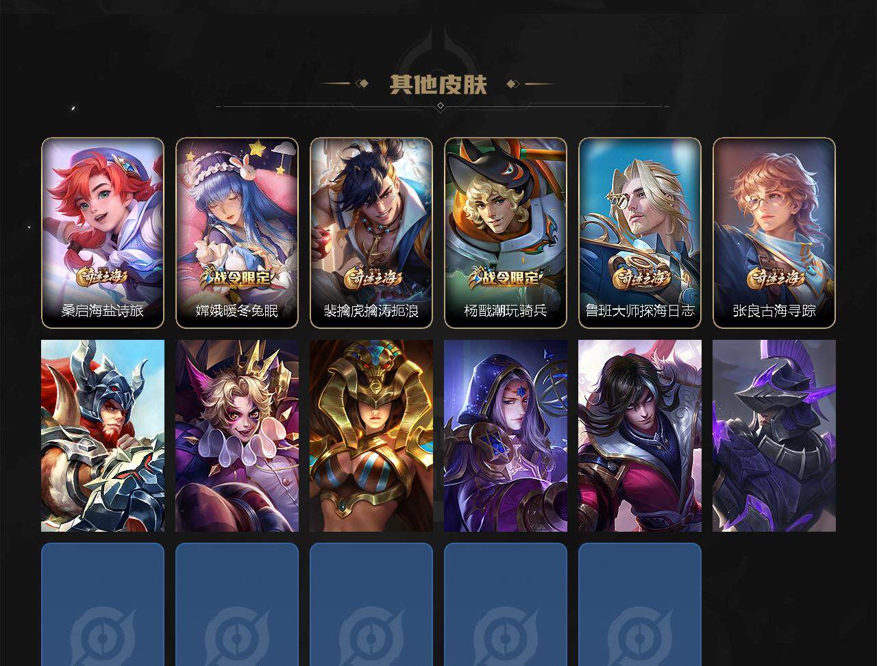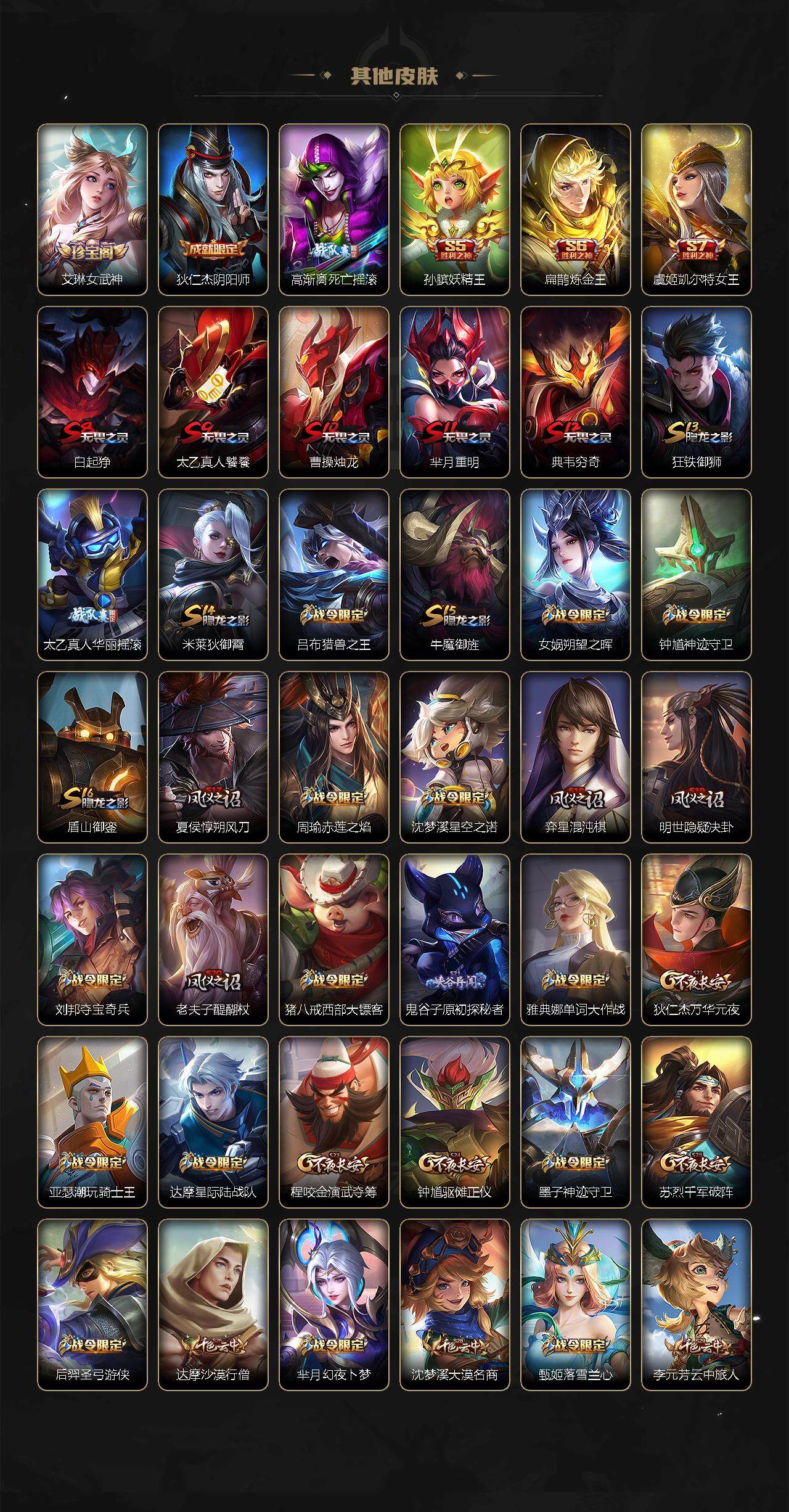 【限定皮肤】:白起狰,狄仁杰阴阳师,虞姬凯尔特女王,赵云皇家上将,赵云龙胆,墨子神迹守卫,嬴政白昼王子,孙尚香蔷薇恋人,孙尚香异界灵契,鲁班七号狮舞东方,鲁班七号乒乒小将,庄周高山流水,高渐离死亡摇滚,阿轲迷踪丽影,钟无艳王者之锤,钟无艳超时空战士,孙膑妖精王,孙膑天狼运算者,扁鹊炼金王,扁鹊奇幻香踪,芈月重明,芈月幻夜卜梦,吕布猎兽之王,吕布御风骁将,周瑜赤莲之焰,元歌云间偶戏,元歌无心,夏侯惇朔风刀,甄姬幽恒,甄姬游园惊梦,甄姬落雪兰心,曹操烛龙,曹操天狼征服者,典韦穷奇,典韦蓝屏警告,典韦岱宗,马可波罗暗影游猎,狄仁杰魔术师,狄仁杰万华元夜,达摩星际陆战队,达摩沙漠行僧,项羽海滩派对,老夫子醍醐杖,老夫子航海奇遇记,关羽冰锋战神,程咬金演武夺筹,刘邦夺宝奇兵,韩信飞衡,兰陵王驯魔猎人,亚瑟潮玩骑士王,孙悟空至尊宝,孙悟空大圣娶亲,孙悟空零号赤焰,孙悟空孙行者,牛魔御旌,后羿如梦令,后羿圣弓游侠,李元芳银河之约,李元芳云中旅人,虞姬霸王别姬,虞姬启明星使,钟馗神迹守卫,钟馗驱傩正仪,杨玉环遇见飞天,杨戬潮玩骑兵,女娲朔望之晖,干将莫邪真爱魔法,雅典娜单词大作战,雅典娜黎明之约,蔡文姬繁星吟游,太乙真人饕餮,太乙真人华丽摇滚,鬼谷子原初探秘者,鬼谷子五谷丰年,诸葛亮时雨天司,苏烈千军破阵,百里玄策原初追逐者,弈星混沌棋,沈梦溪星空之诺,沈梦溪大漠名商,明世隐疑决卦,裴擒虎天狼狩猎者,裴擒虎李小龙,裴擒虎擒涛扼浪,狂铁御狮,米莱狄御霄,云中君纤云弄巧,盾山御銮,猪八戒西部大镖客,猪八戒猪悟能,上官婉儿梁祝,嫦娥如梦令,嫦娥拒霜思,嫦娥暖冬兔眠,蒙犽狂想玩偶喵,鲁班大师探海日志,桑启海盐诗旅,暃星界游侠,艾琳女武神,张良古海寻踪