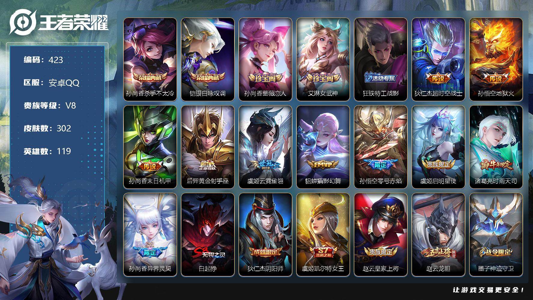[10958190]【商品标题】:安卓Q-V0-秩序白银II段位-119英雄-302皮肤-2典藏-0珍品无双-0无双-0珍品传说-10传说-97史诗