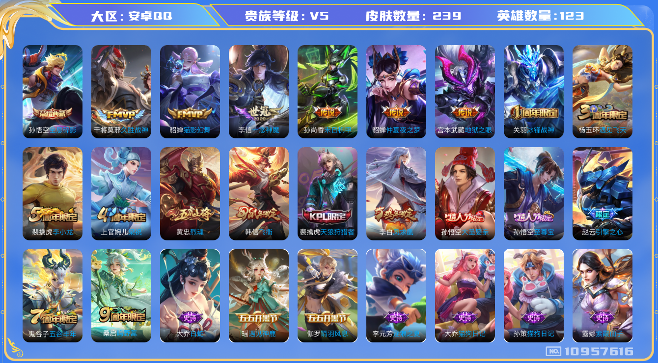 [10957616]【商品标题】:安卓Q-V5-尊贵铂金II段位-123英雄-239皮肤-1典藏-0珍品无双-0无双-0珍品传说-8传说-66史诗