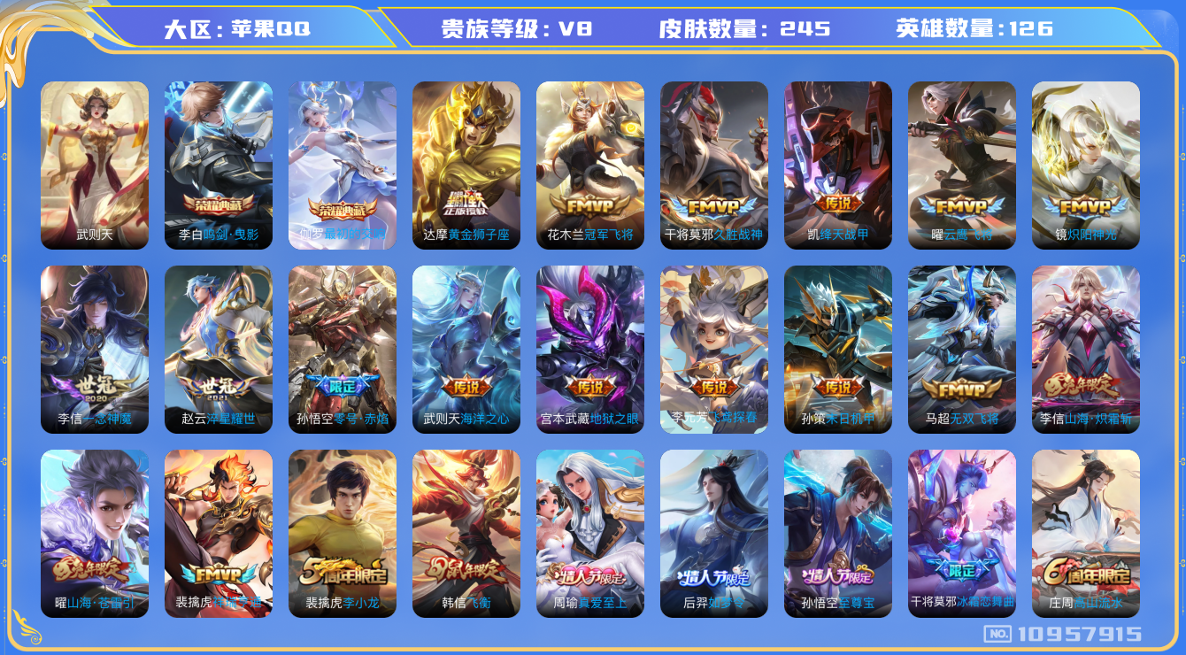 [10957915]【商品标题】:苹果Q-V8-至尊星耀II段位-126英雄-245皮肤-2典藏-0珍品无双-0无双-0珍品传说-23传说-71史诗