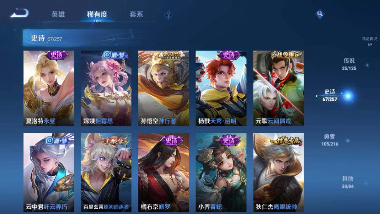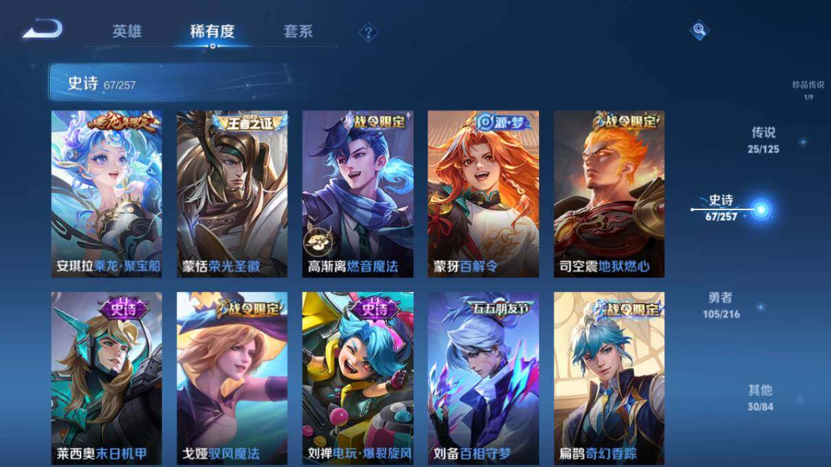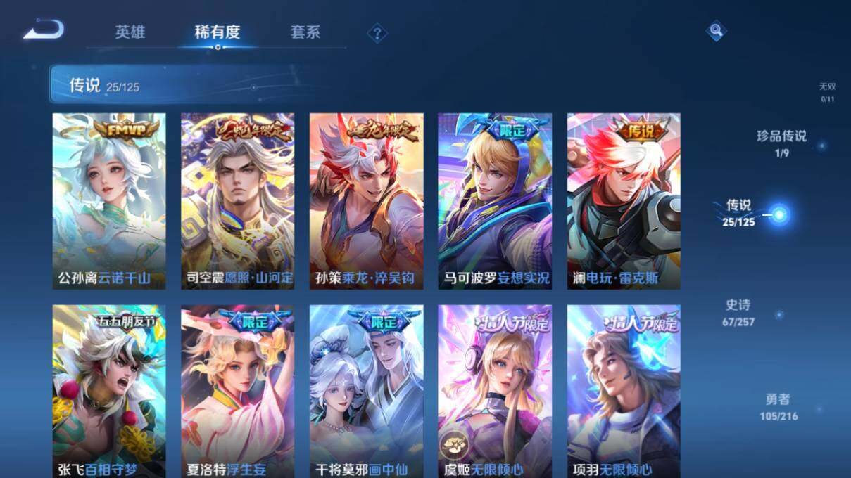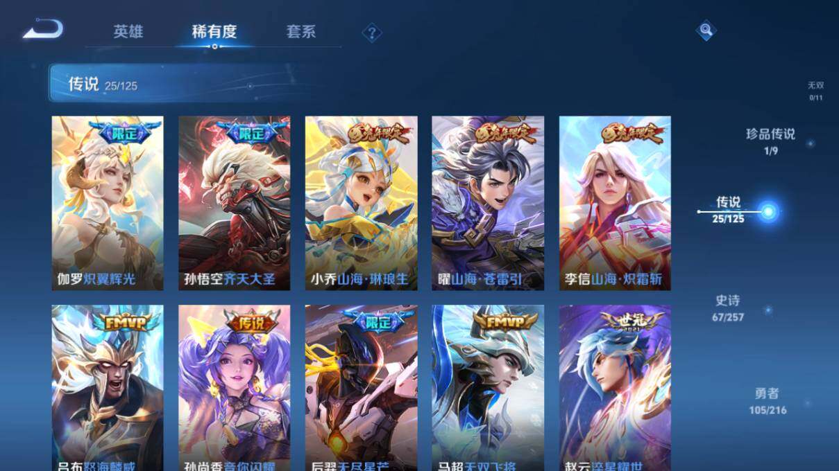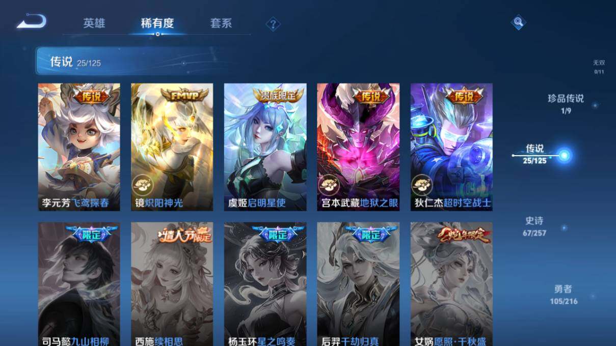 【传说皮肤】:狄仁杰超时空战士,宫本武藏地狱之眼,虞姬启明星使,镜炽阳神光,李元芳飞鸢探春,赵云淬星耀世,马超无双飞将,后羿无尽星芒,孙尚香音你闪耀,吕布怒海麟威,李信山海炽霜斩,曜山海苍雷引,小乔山海琳琅生,孙悟空齐天大圣,伽罗炽翼辉光,项羽无限倾心,虞姬无限倾心,干将莫邪画中仙,夏洛特浮生妄,张飞百相守梦,澜电玩雷克斯,马可波罗妄想实况,孙策乘龙淬吴钩,司空震愿照山河定,公孙离云诺千山