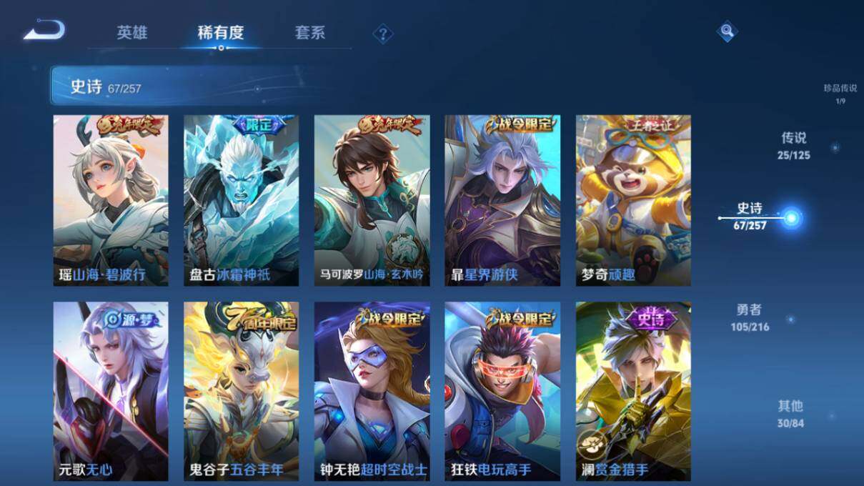 【赛季限定】:兰陵王金庭之子,张良古海寻踪,李元芳云中旅人,百里玄策原初追逐者,梦奇顽趣,沈梦溪大漠名商,裴擒虎擒涛扼浪,鲁班大师探海日志,桑启海盐诗旅,鬼谷子天穹祈灯,蒙恬荣光圣徽,刘邦剑破天穹