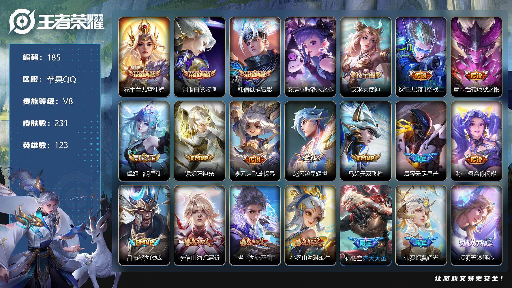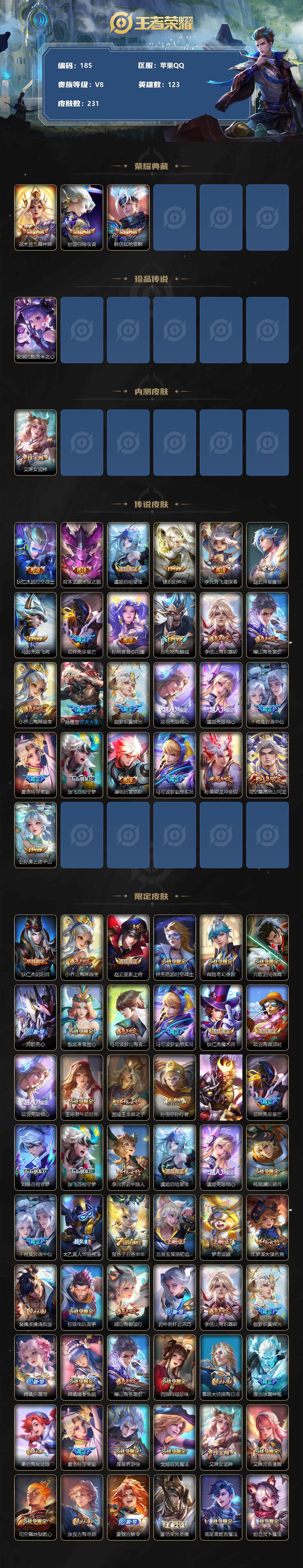 [10957726]【商品标题】:苹果Q-V8-最强王者段位-123英雄-231皮肤-3典藏-0珍品无双-0无双-1珍品传说-25传说-66史诗