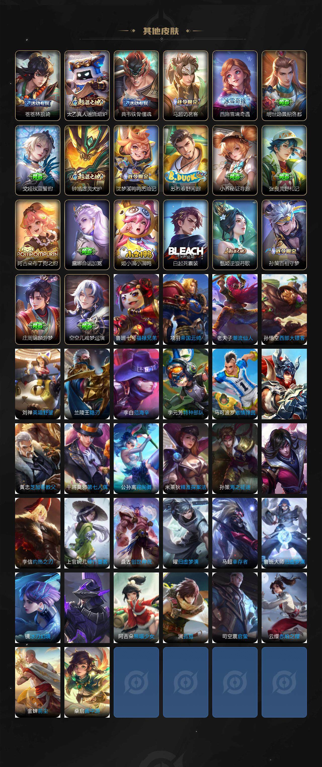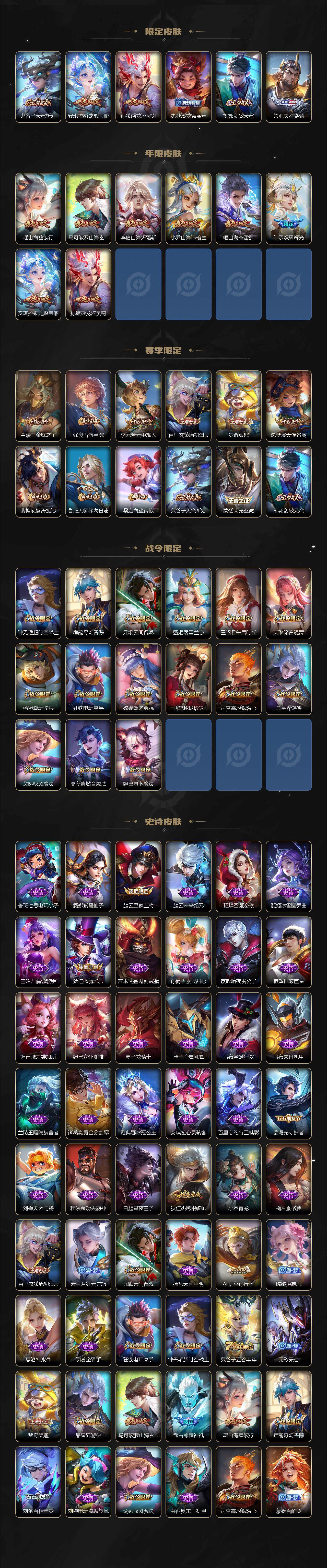 【限定皮肤】:狄仁杰阴阳师,小乔山海琳琅生,赵云皇家上将,钟无艳超时空战士,扁鹊奇幻香踪,元歌云间偶戏,元歌无心,甄姬落雪兰心,马可波罗山海玄木吟,马可波罗妄想实况,狄仁杰魔术师,项羽海滩派对,项羽无限倾心,王昭君午后时光,兰陵王金庭之子,孙悟空孙行者,孙悟空齐天大圣,后羿无尽星芒,刘备百相守梦,张飞百相守梦,李元芳云中旅人,虞姬启明星使,虞姬无限倾心,杨戬潮玩骑兵,干将莫邪画中仙,太乙真人华丽摇滚,鬼谷子五谷丰年,百里玄策原初追逐者,梦奇顽趣,沈梦溪大漠名商,裴擒虎擒涛扼浪,狂铁电玩高手,瑶山海碧波行,云中君纤云弄巧,李信山海炽霜斩,伽罗炽翼辉光,嫦娥拒霜思,嫦娥暖冬兔眠,曜山海苍雷引,西施玲珑珍味,鲁班大师探海日志,盘古冰霜神祇,桑启海盐诗旅,夏洛特浮生妄,暃星界游侠,戈娅驭风魔法,艾琳女武神,艾琳流音漫舞,司空震地狱燃心,张良古海寻踪,蒙犽百解令,蒙恬荣光圣徽,高渐离燃音魔法,妲己灵卜魔法,鬼谷子天穹祈灯,安琪拉乘龙聚宝船,孙策乘龙淬吴钩,沈梦溪龙舞盛年,刘邦剑破天穹,关羽决胜骁骑