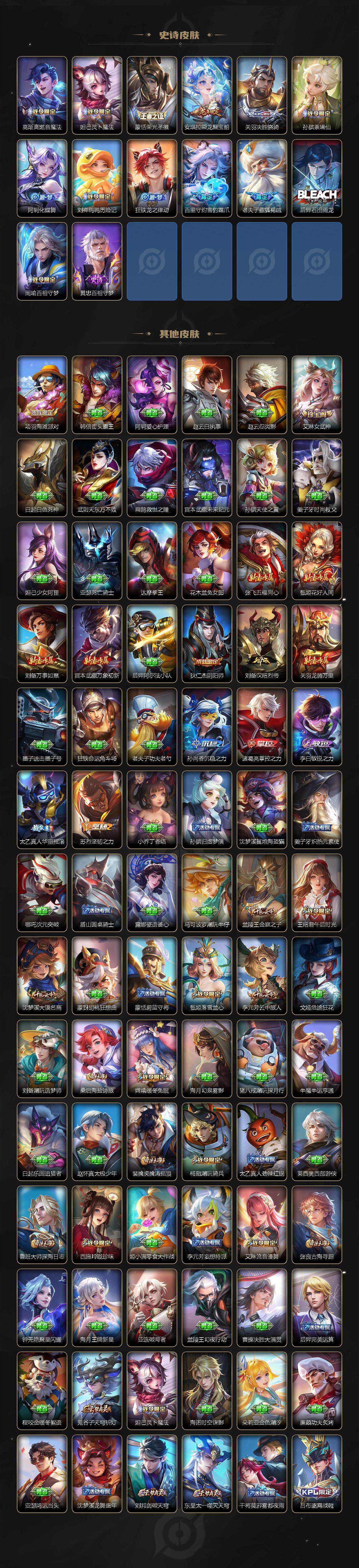 - [11523758]V7 1典藏 10传说 123英雄 258皮肤 可修改实名 优质装备:最初的交响(伽罗典藏),冠军飞将,绛天战甲(鸡嘴战神),末日机甲-孙尚香(绿蚂蚱),地狱火,零号·赤焰,地狱之眼 珍宝阁皮:妄想食味,女武神 限定皮:愿照·岁时盈(虞姬年限),至尊宝,时雨天司(水龙头),遇见飞天,游园惊梦,梁祝,御风骁将(吕布年限),祈雪灵祝(雪兔子),李小龙,辉光之辰,如梦令-后羿,霸王别姬-虞姬,默契交锋-兰陵王,默契交锋-花木兰,引擎之心 史诗皮:器灵·浮梦炉,化蝶舞,紫霞仙子,电玩小子(小书包),黄金分割率,特工魅影,千年之狐,江河有灵,百解令(蒙犽),偶像歌手,暗夜猫娘,末日机甲-吕布,猫狗日记-孙策,乱世虎臣,女仆咖啡,摇滚巨星,水果甜心,绅士熊喵,天才门将,星夜王子,心灵骇客,功夫厨神,德古拉伯爵,暗隐猎兽者,幽灵船长,鬼剑武藏,舞动绿茵,地狱岩魂,纤云弄巧,繁星吟游(呼啦呼啦),拒霜思,缤纷独角兽,乘风破浪,逐浪之夏,月团寄思,水晶猎龙者,曙光守护者,金属风暴,圣诞狂欢,鹰眼统帅,暗夜贵公子,魅力维加斯