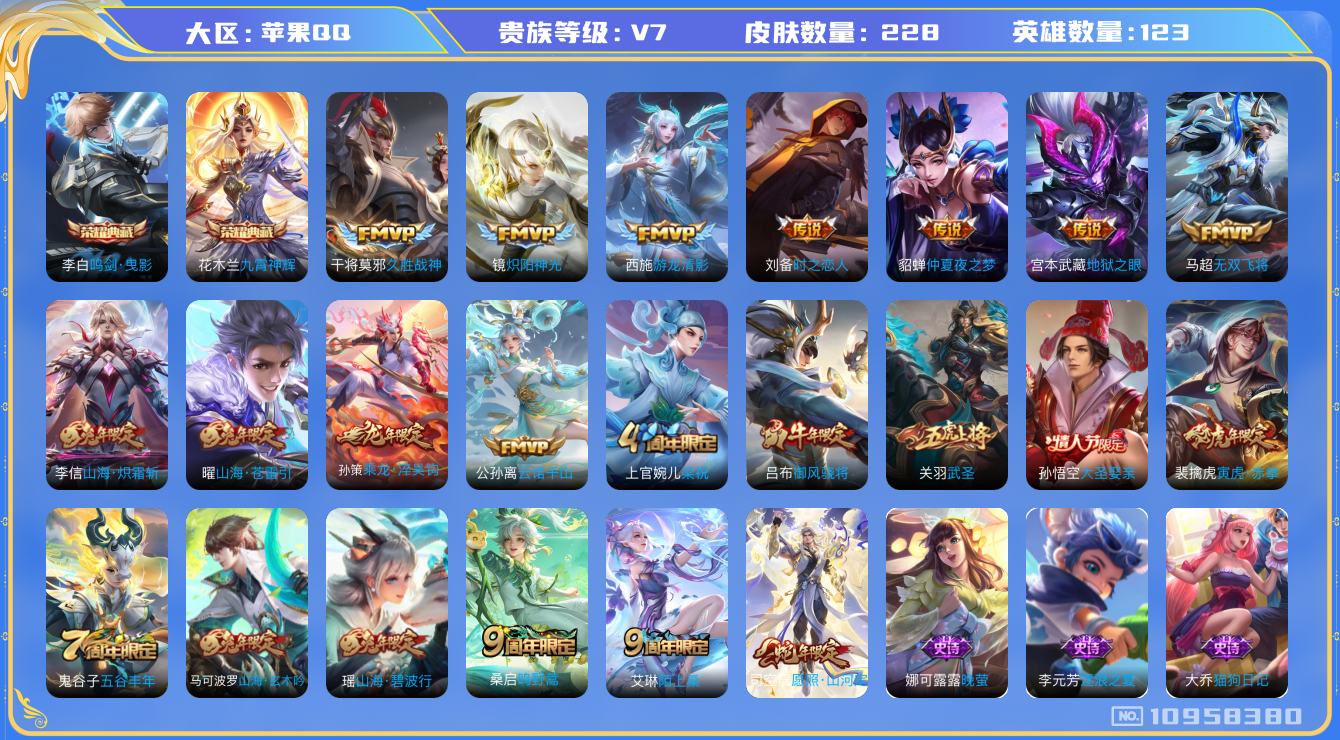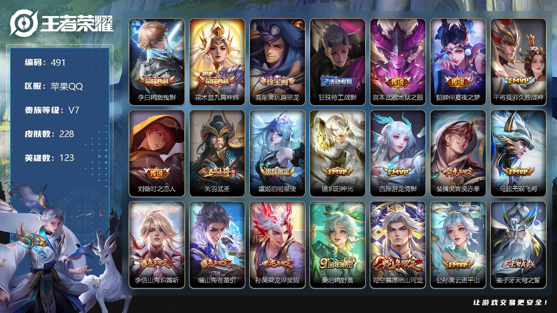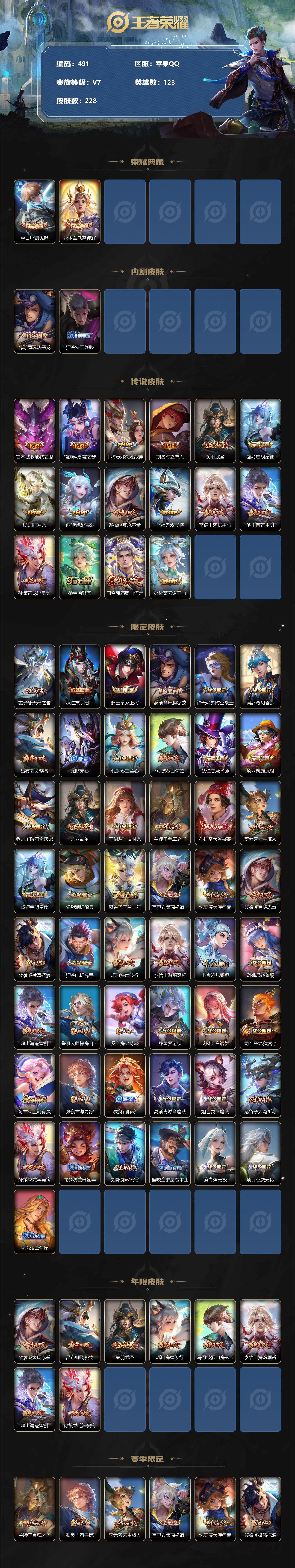 [10958380]【商品标题】:苹果Q-V7-永恒钻石V段位-123英雄-228皮肤-2典藏-0珍品无双-0无双-0珍品传说-16传说-66史诗