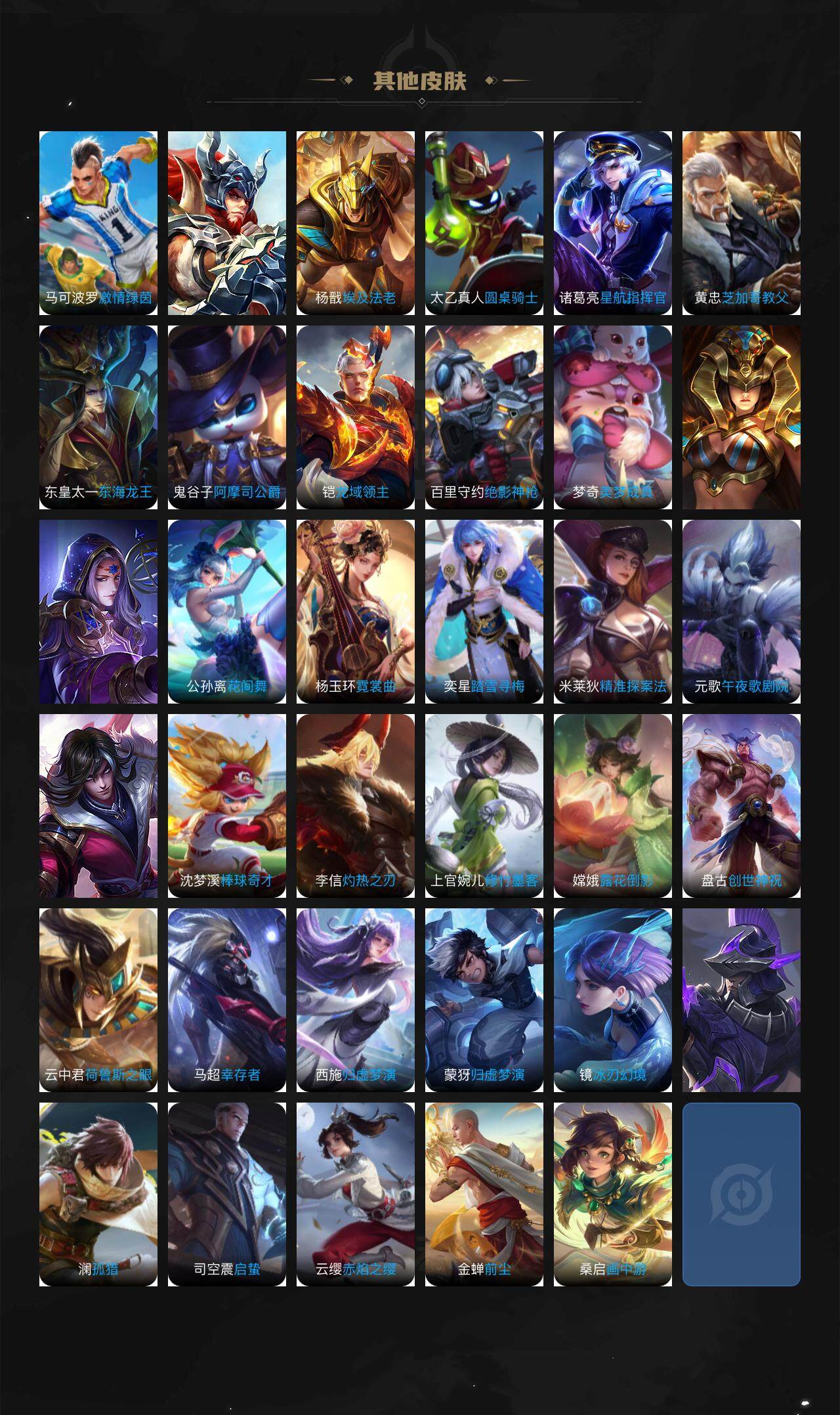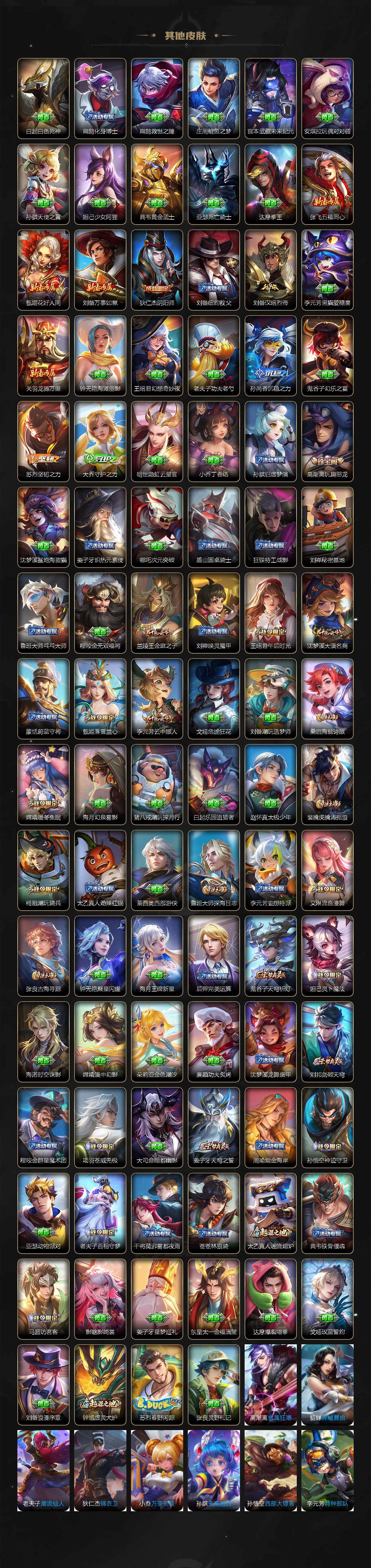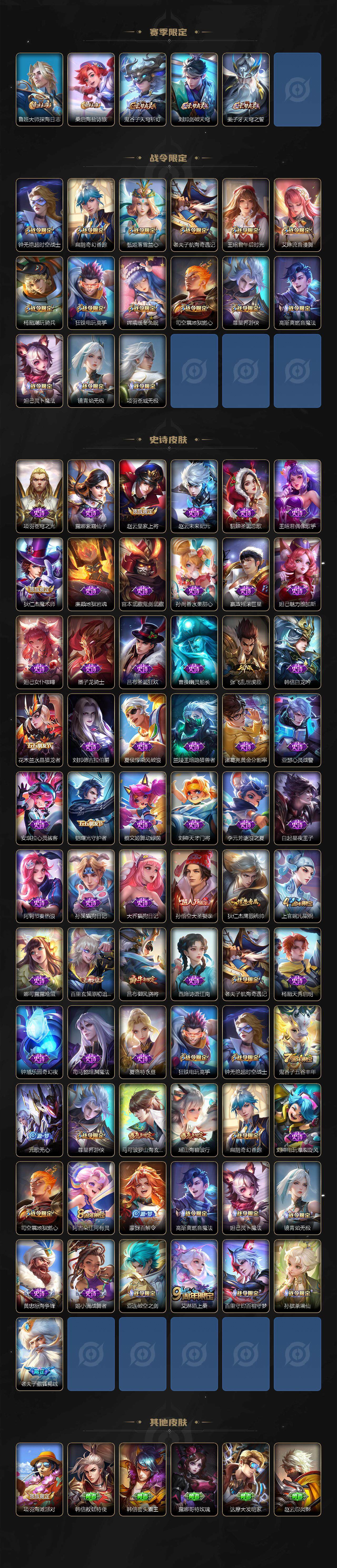 【限定皮肤】:姜子牙天穹之誓,狄仁杰阴阳师,赵云皇家上将,高渐离玩趣恶龙,钟无艳超时空战士,扁鹊奇幻香踪,吕布御风骁将,元歌无心,甄姬落雪兰心,马可波罗山海玄木吟,狄仁杰魔术师,项羽海滩派对,老夫子航海奇遇记,关羽武圣,王昭君午后时光,兰陵王金庭之子,孙悟空大圣娶亲,李元芳云中旅人,虞姬启明星使,杨戬潮玩骑兵,鬼谷子五谷丰年,百里玄策原初追逐者,沈梦溪大漠名商,裴擒虎寅虎赤拳,裴擒虎擒涛扼浪,狂铁电玩高手,瑶山海碧波行,李信山海炽霜斩,上官婉儿梁祝,嫦娥暖冬兔眠,曜山海苍雷引,鲁班大师探海日志,桑启海盐诗旅,暃星界游侠,艾琳流音漫舞,司空震地狱燃心,阿古朵江河有灵,张良古海寻踪,蒙犽百解令,高渐离燃音魔法,妲己灵卜魔法,鬼谷子天穹祈灯,孙策乘龙淬吴钩,沈梦溪龙舞盛年,刘邦剑破天穹,程咬金群星魔术团,镜青焰无极,项羽苍威无极,周瑜熔金海岸