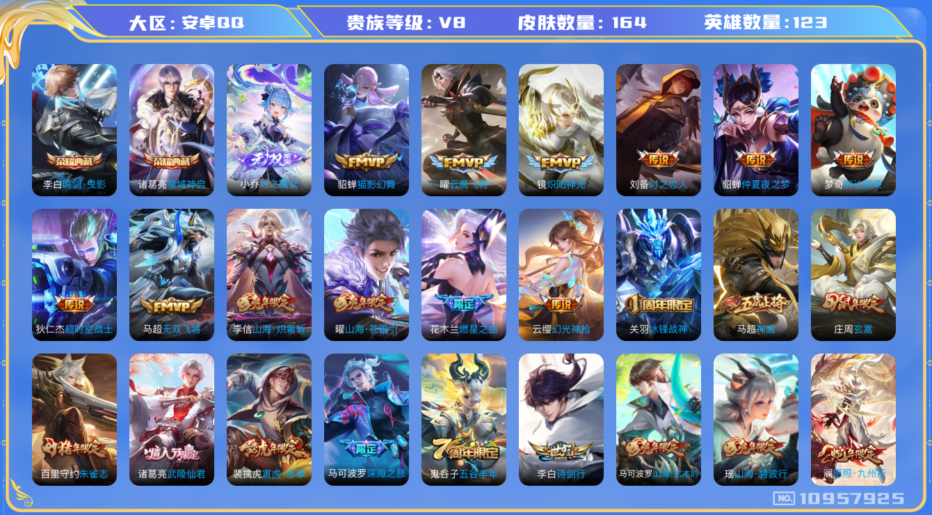 [10957925]【商品标题】:安卓Q-V8-至尊星耀I段位-123英雄-164皮肤-2典藏-0珍品无双-1无双-0珍品传说-19传说-49史诗