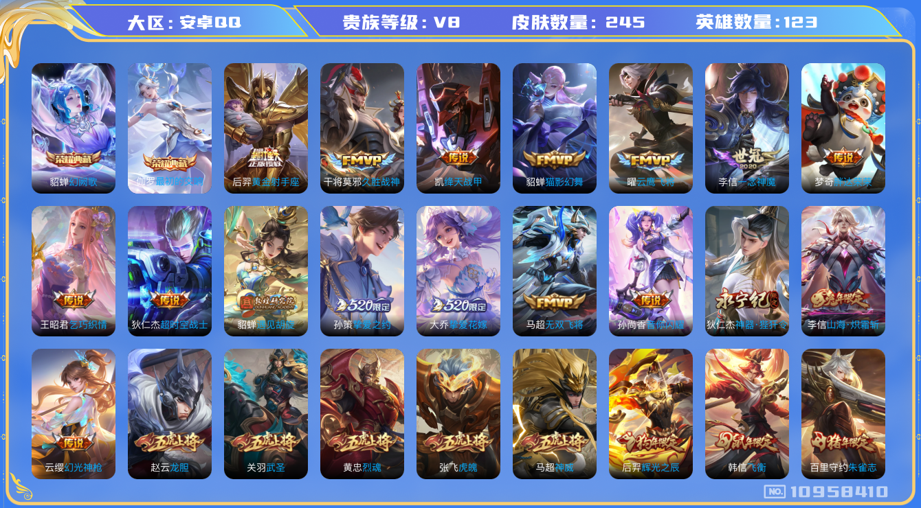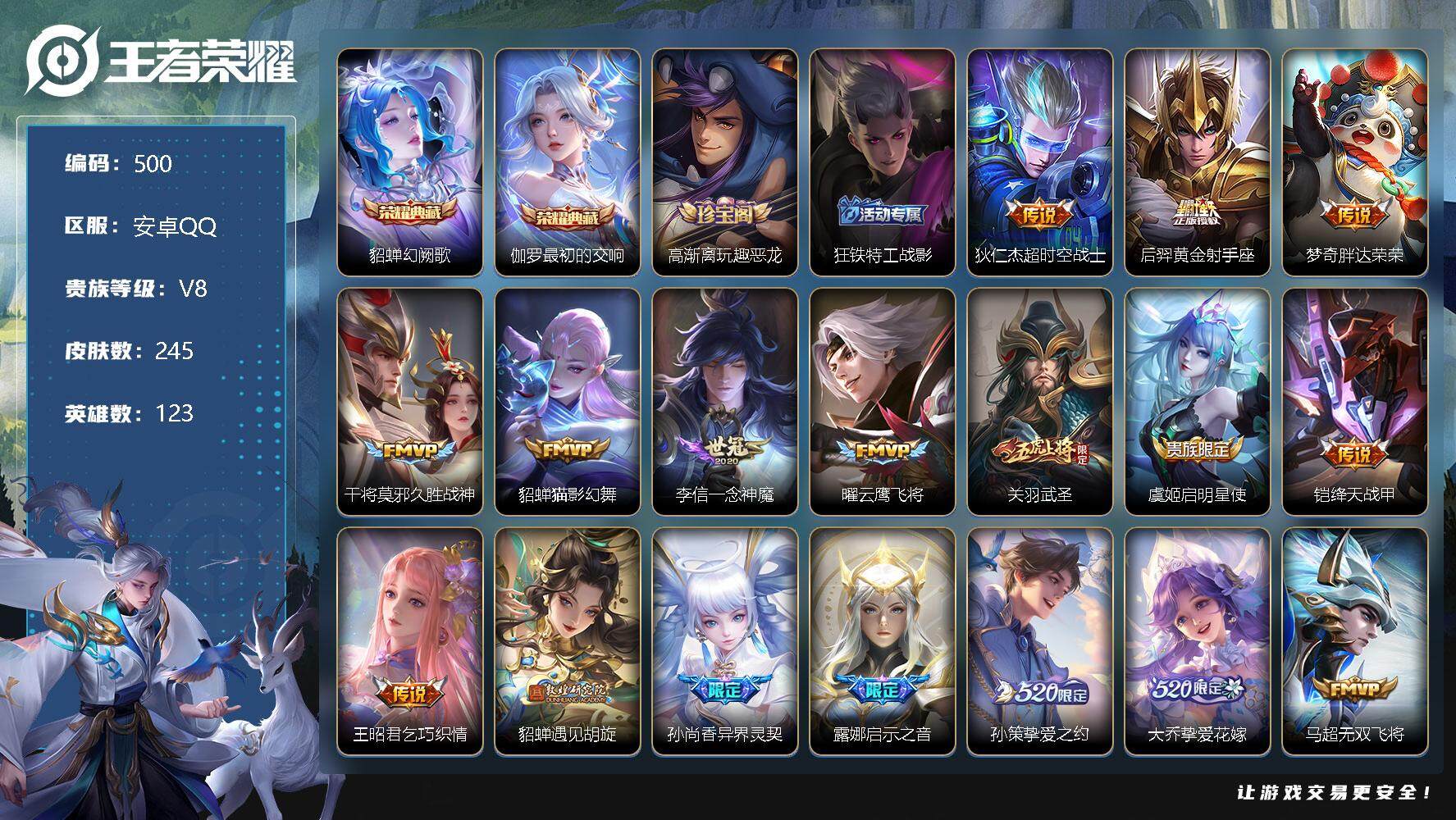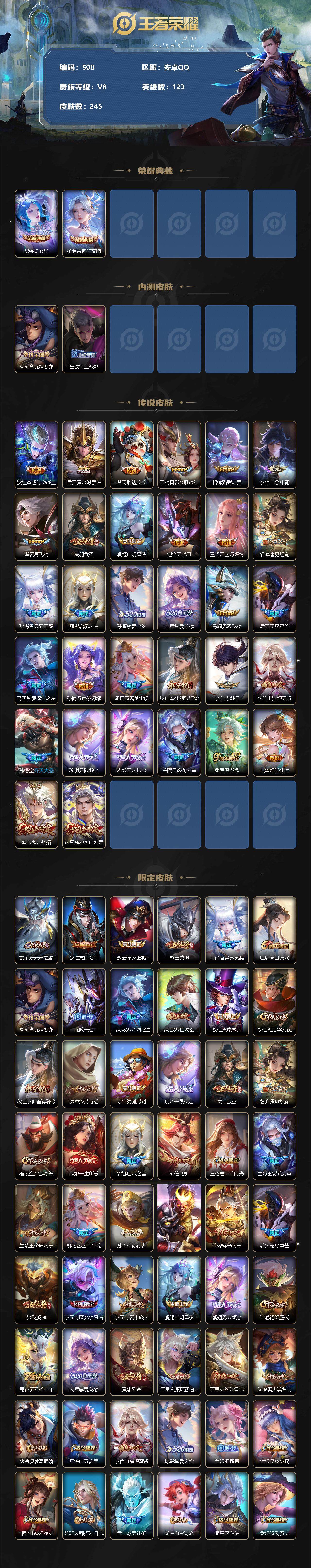 [10958410]【商品标题】:安卓Q-V8-永恒钻石I段位-123英雄-245皮肤-2典藏-0珍品无双-0无双-0珍品传说-32传说-69史诗
