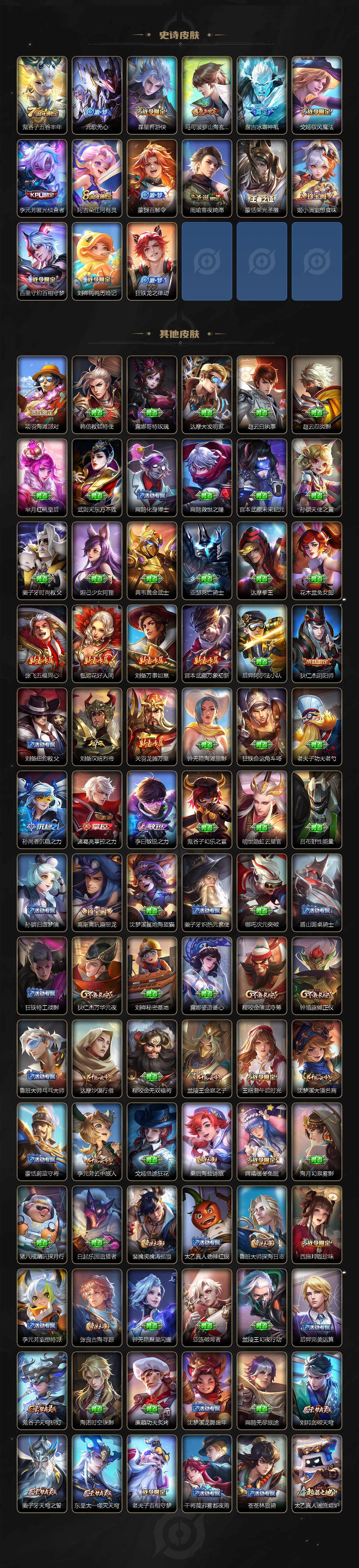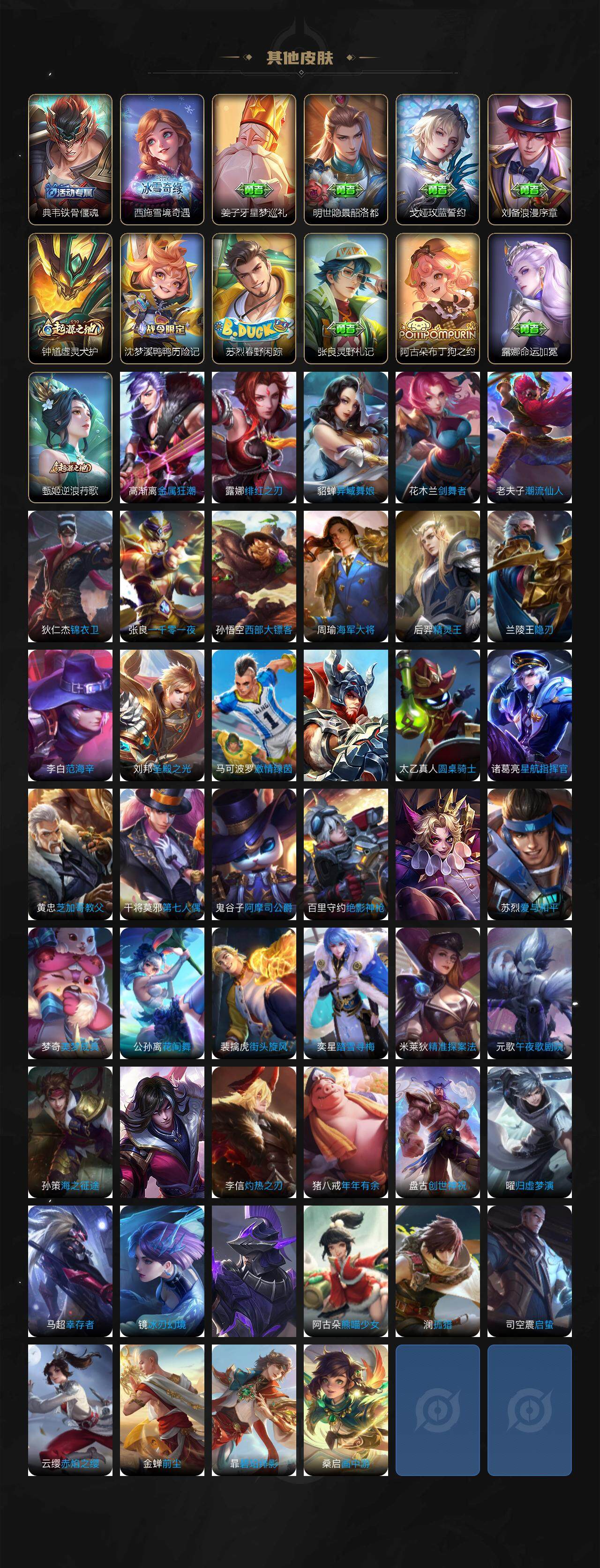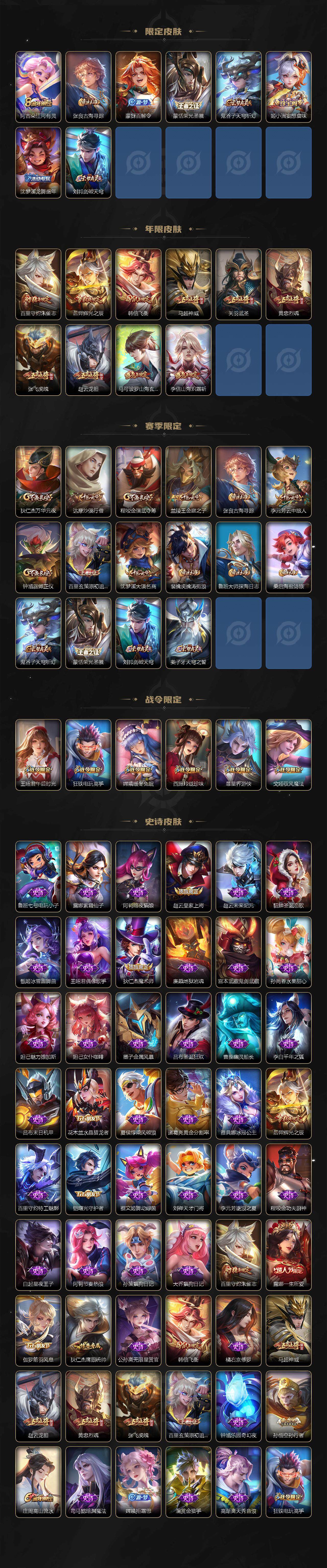 【限定皮肤】:姜子牙天穹之誓,狄仁杰阴阳师,赵云皇家上将,赵云龙胆,孙尚香异界灵契,庄周高山流水,高渐离玩趣恶龙,元歌无心,马可波罗深海之息,马可波罗山海玄木吟,狄仁杰魔术师,狄仁杰万华元夜,狄仁杰神器狴犴令,达摩沙漠行僧,项羽海滩派对,项羽无限倾心,关羽武圣,貂蝉遇见胡旋,程咬金演武夺筹,露娜一生所爱,露娜启示之音,韩信飞衡,王昭君午后时光,兰陵王影龙天霄,兰陵王金庭之子,娜可露露前尘镜,孙悟空孙行者,孙悟空齐天大圣,后羿辉光之辰,后羿无尽星芒,张飞虎魄,李元芳匿光侦查者,李元芳云中旅人,虞姬启明星使,虞姬无限倾心,钟馗驱傩正仪,鬼谷子五谷丰年,大乔挚爱花嫁,黄忠烈魂,百里玄策原初追逐者,百里守约朱雀志,沈梦溪大漠名商,裴擒虎擒涛扼浪,狂铁电玩高手,李信山海炽霜斩,孙策挚爱之约,嫦娥拒霜思,嫦娥暖冬兔眠,西施玲珑珍味,鲁班大师探海日志,盘古冰霜神祇,桑启海盐诗旅,暃星界游侠,戈娅驭风魔法,阿古朵江河有灵,张良古海寻踪,蒙犽百解令,蒙恬荣光圣徽,鬼谷子天穹祈灯,姬小满妄想食味,沈梦溪龙舞盛年,刘邦剑破天穹
