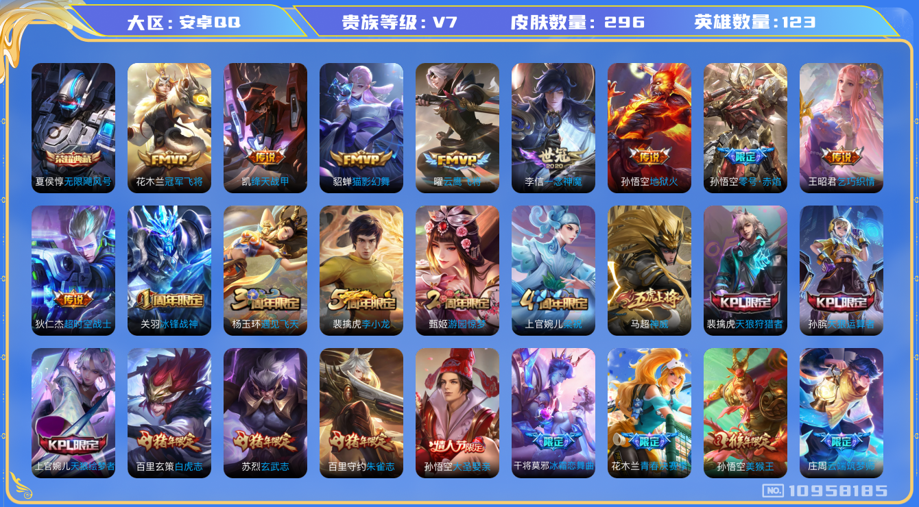 [10958185]【商品标题】:安卓Q-V7-永恒钻石III段位-123英雄-296皮肤-1典藏-0珍品无双-0无双-0珍品传说-12传说-90史诗