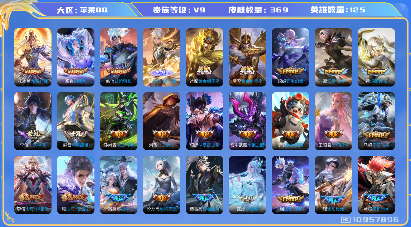 [10957896]【商品标题】:苹果Q-V9-最强王者段位-125英雄-369皮肤-3典藏-0珍品无双-1无双-0珍品传说-40传说-97史诗