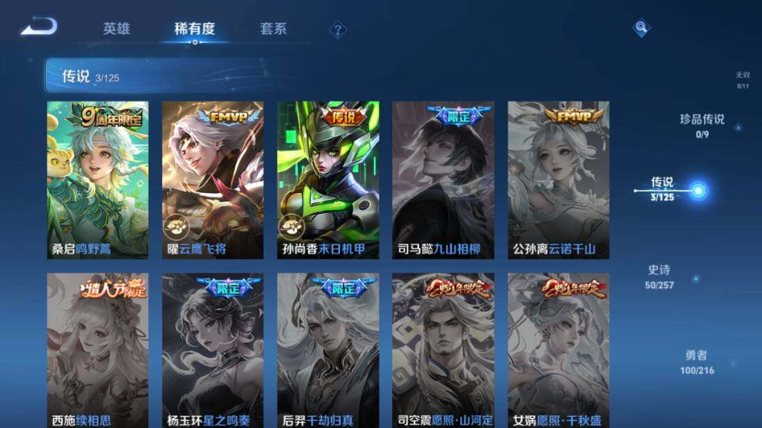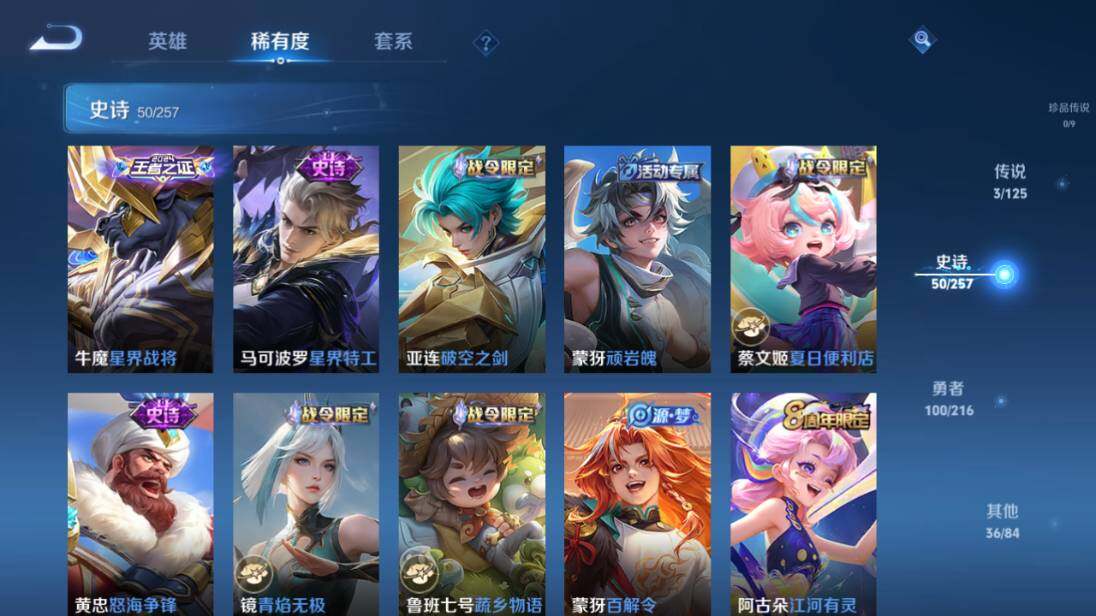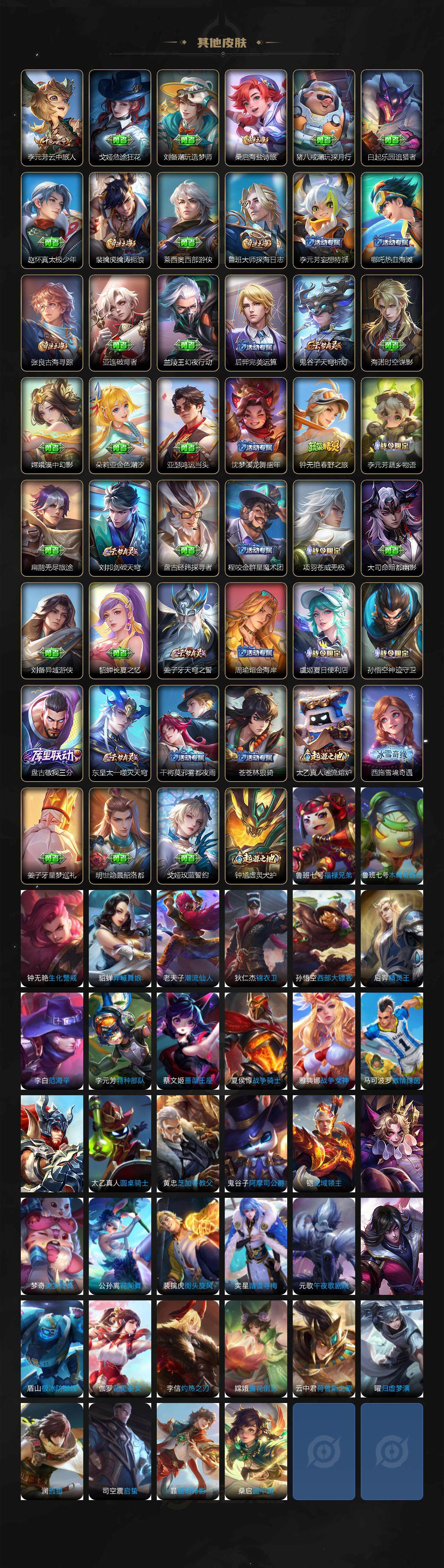 【限定皮肤】:蒙犽顽岩魄,蔡文姬夏日便利店,虞姬夏日便利店,姜子牙天穹之誓,狄仁杰阴阳师,赵云皇家上将,孙尚香蔷薇恋人,高渐离玩趣恶龙,元歌无心,狄仁杰魔术师,狄仁杰万华元夜,达摩沙漠行僧,项羽海滩派对,老夫子醍醐杖,程咬金演武夺筹,兰陵王金庭之子,孙悟空孙行者,后羿圣弓游侠,李元芳银河之约,李元芳云中旅人,钟馗驱傩正仪,干将莫邪胡桃夹子,鬼谷子原初探秘者,鬼谷子五谷丰年,百里玄策原初追逐者,弈星混沌棋,沈梦溪大漠名商,明世隐疑决卦,裴擒虎李小龙,裴擒虎擒涛扼浪,云中君纤云弄巧,上官婉儿梁祝,鲁班大师探海日志,桑启海盐诗旅,阿古朵江河有灵,张良古海寻踪,蒙犽百解令,鬼谷子天穹祈灯,沈梦溪龙舞盛年,鲁班七号蔬乡物语,李元芳蔬乡物语,刘邦剑破天穹,程咬金群星魔术团,镜青焰无极,项羽苍威无极,刘备异域游侠,周瑜熔金海岸